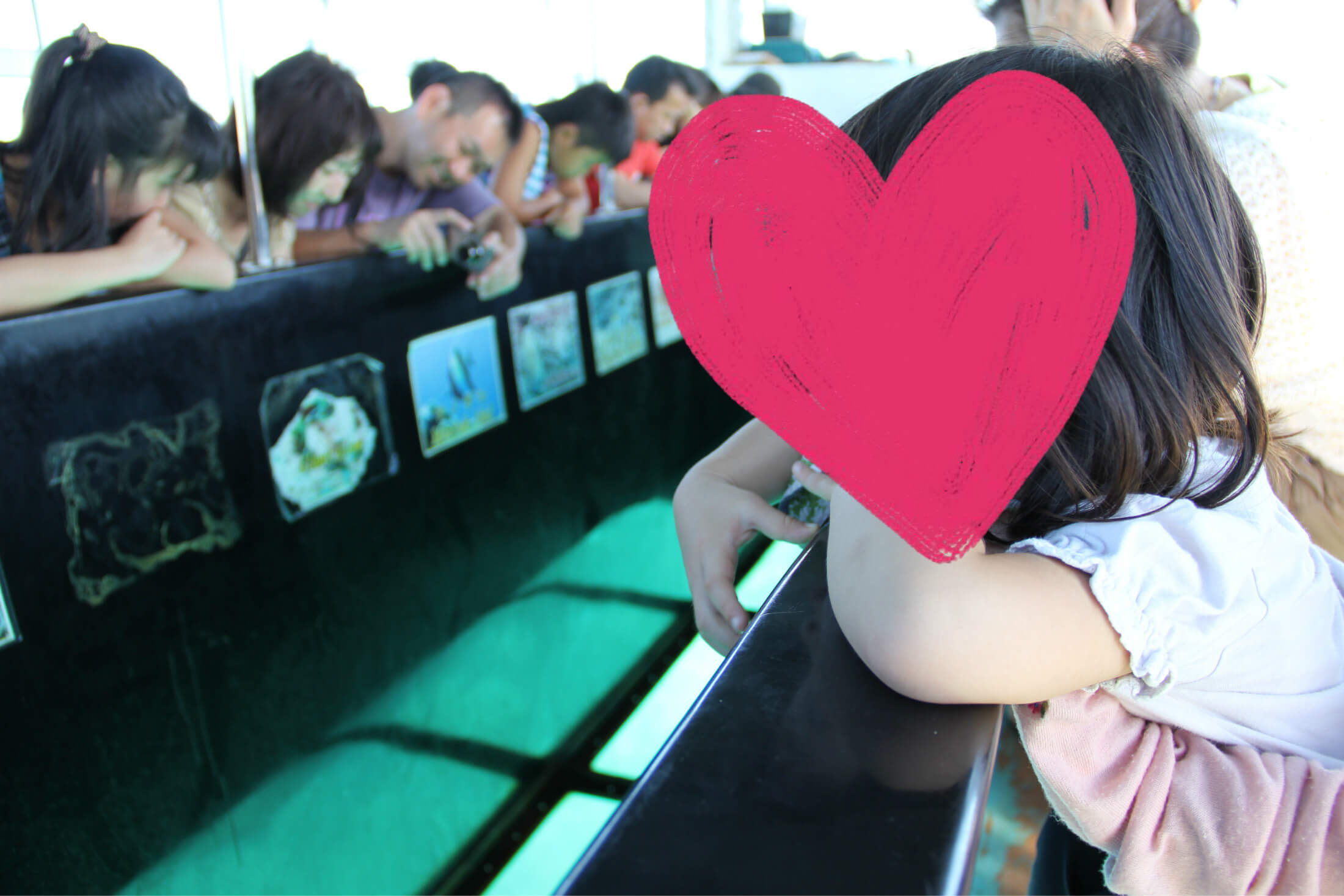 船底の真ん中がガラス張りになっていて、サンゴ礁や熱帯魚が見れます。写真はうちの娘です。当時2歳でしたが飽きずにずっと覗いていました。カクレクマノミを探せば大人も夢中になれますよ(笑)