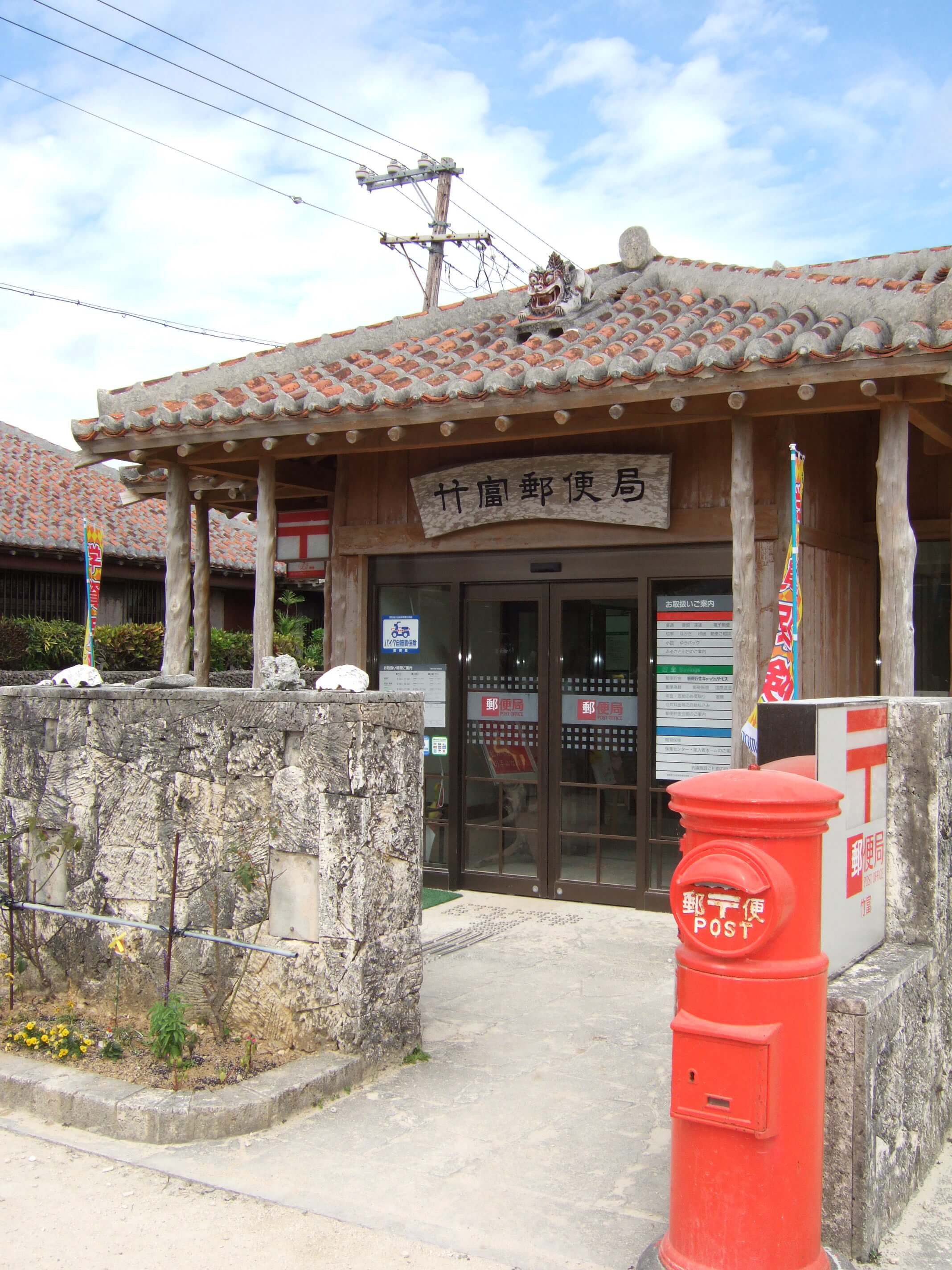 昔ながらの丸いポストのせいか懐かしい感じがする郵便局です。屋根の上のシーサーもかわいらしいです。絵葉書を買ったり、記念スタンプをもらったりすれば記念になります。切手のセットを売っている時もありました。