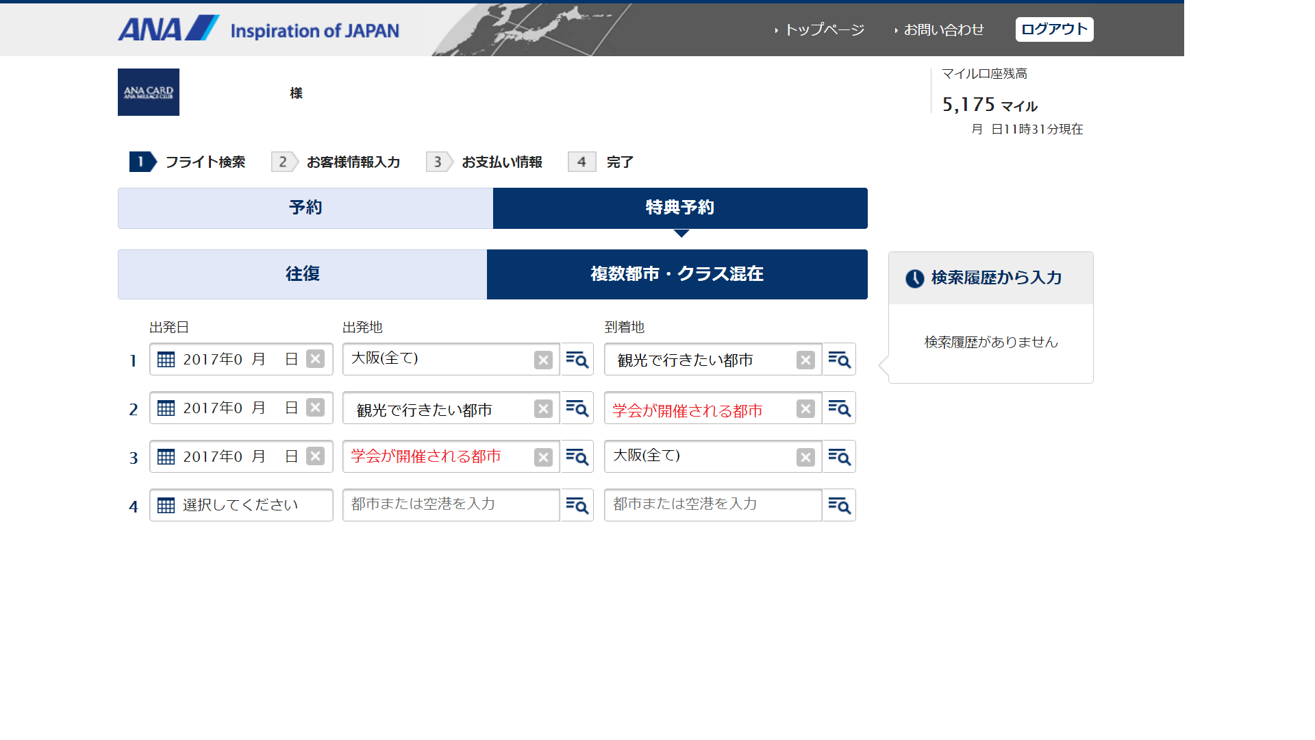 日程的に週末が重なったので仕事を休まずに数日前に出発できることがわかりました。そこでせっかくの機会なので学会会場入りする前に他の都市を観光してから学会会場入りすることを企み、特典航空券の検索をしてみました。