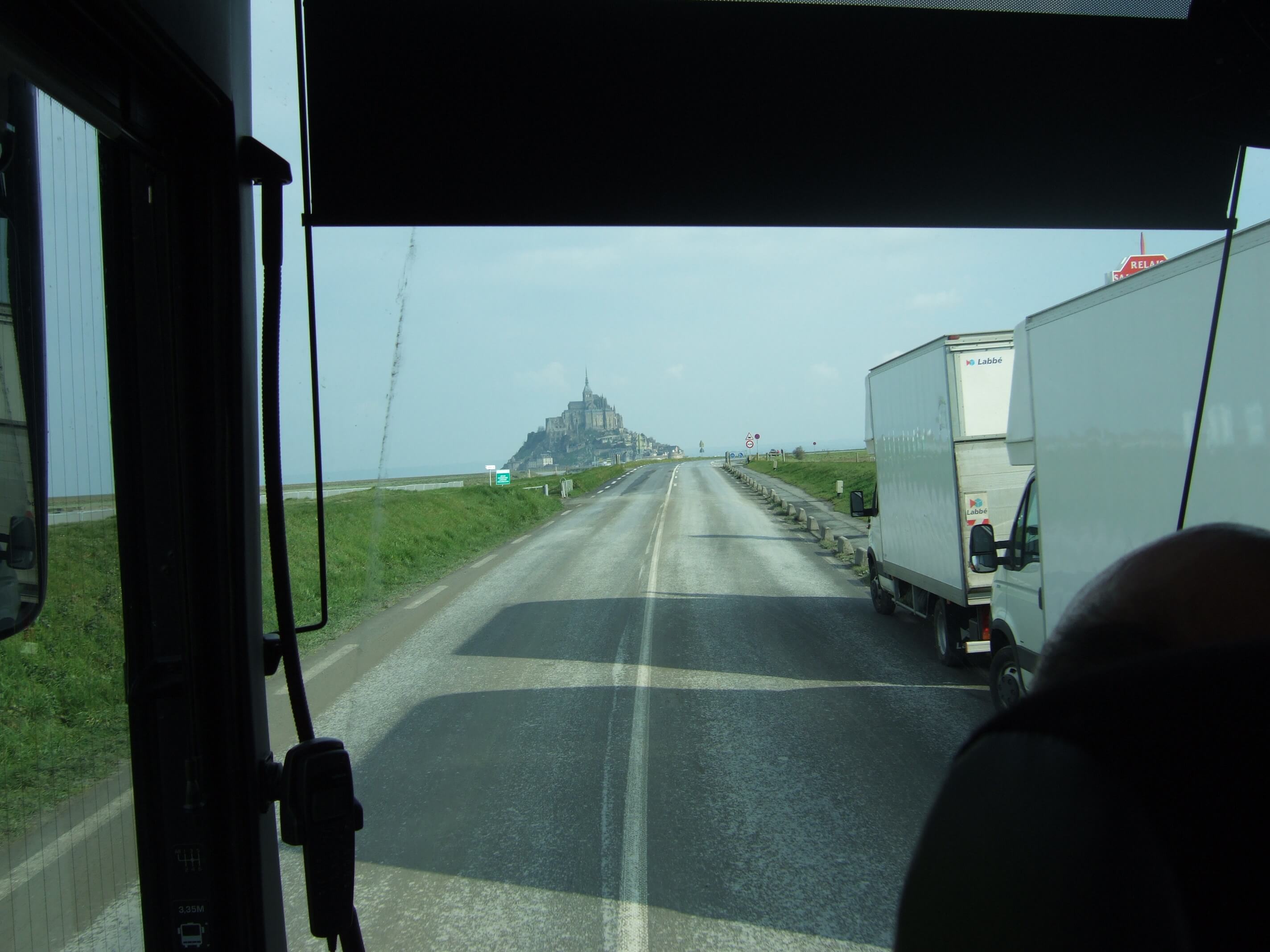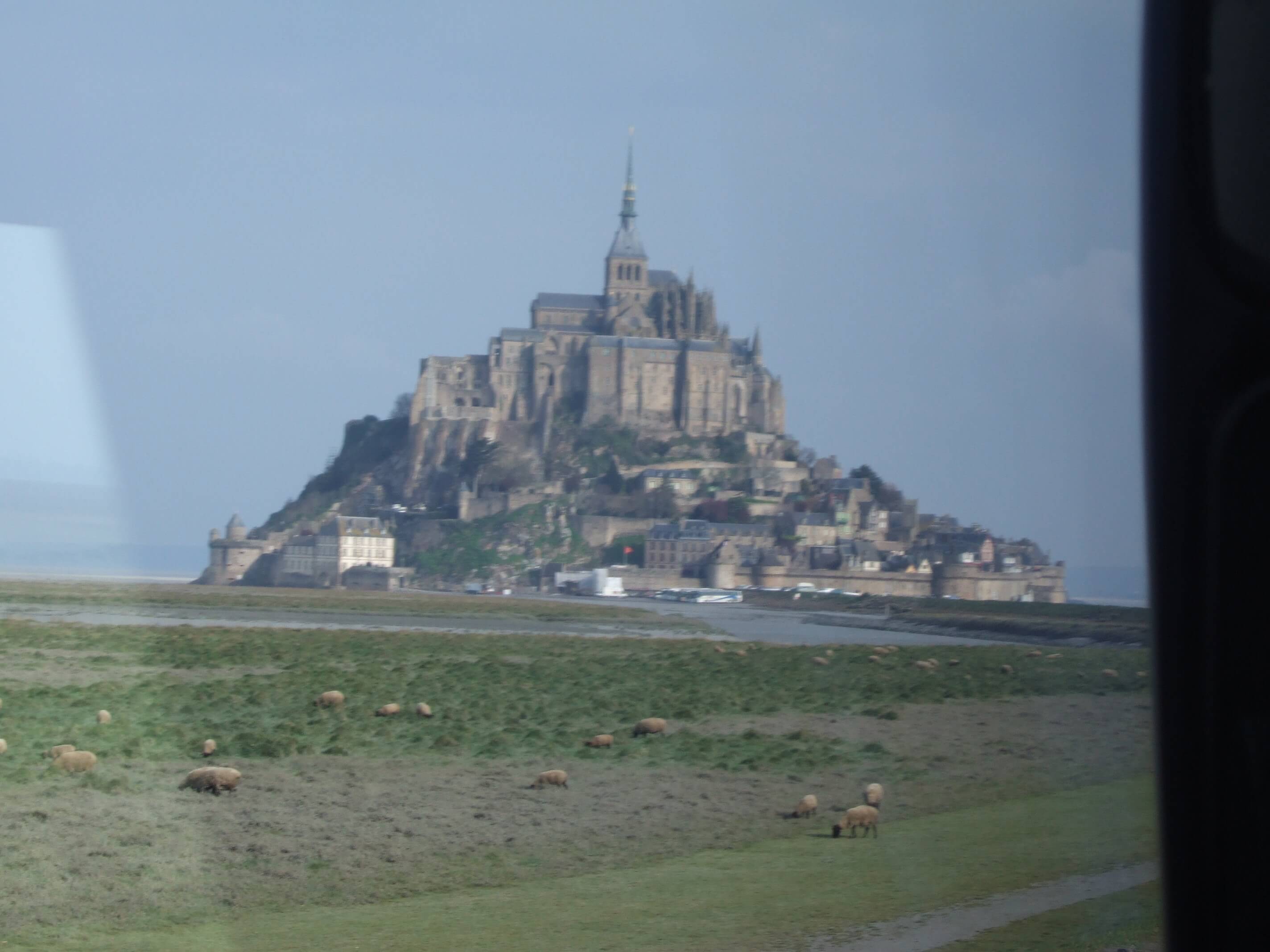 このようにバスの窓からモンサンミッシェルが見え、草原や海が広がる中に浮かぶあの荘厳な独特の姿がだんだん大きくなってくるのはなんともいえない感動でした。頑張って並んで最前列に座ってよかった!