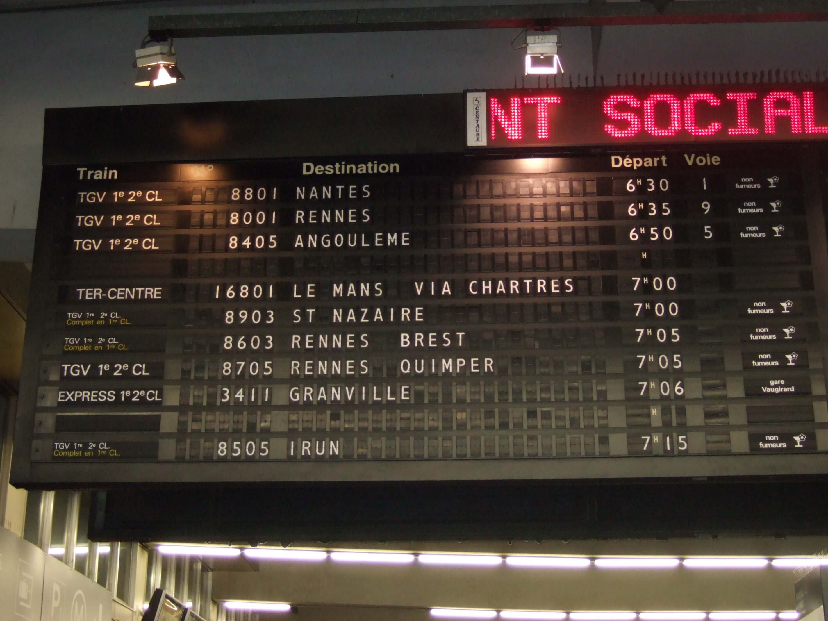 巨大な出発案内でホームを確認しておきます。同じ時間にレンヌ行きが2つありますが2つの列車がつながっておりレンヌで切り離して違う目的地へ向かうようです。