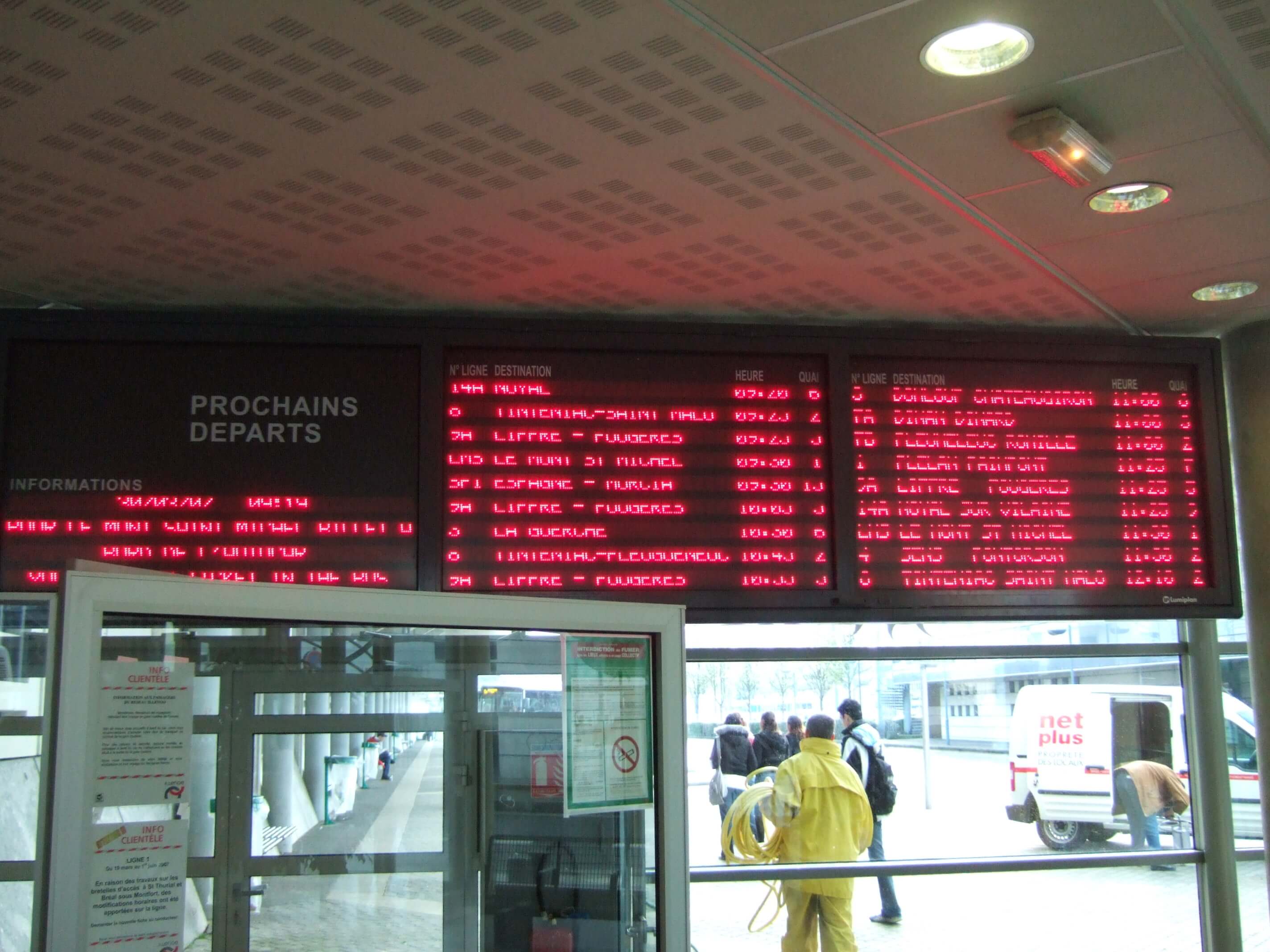 正面のターミナルは近距離用なので、右手の方に向かいます。Gare Routiereと書いてある建物が長距離用バスターミナルです。建物に入ると電光掲示板がありこちらで乗り場を確認します。