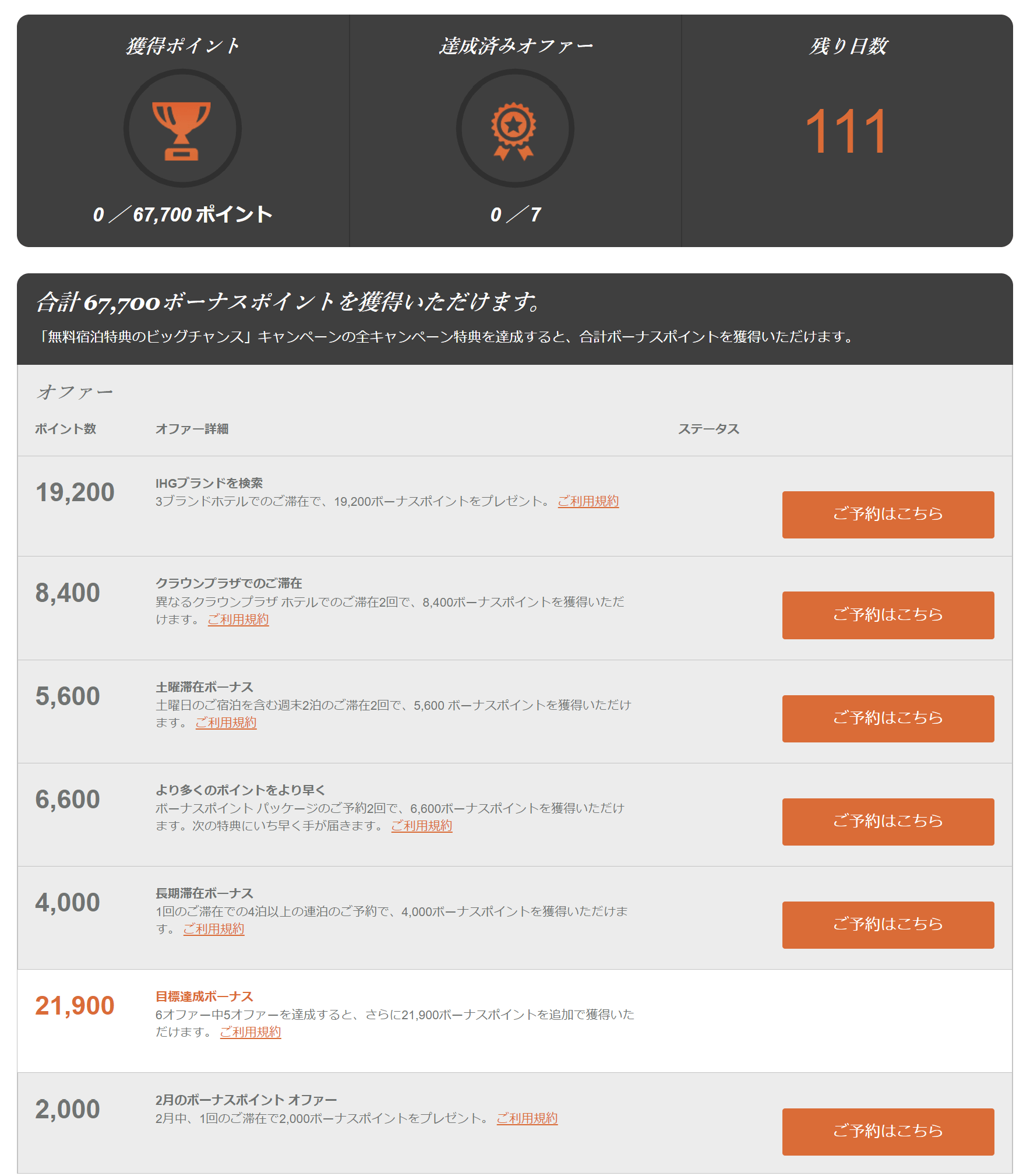 IHGはいつもの「スピードアップキャンペーン」ではありませんが、内容はスピードアップキャンペーンの時と変わらず、いくつかのお題(オファー)があり、そのお題をクリアーするごとにポイントが付与されるものです。 与えられるオファーは人によって違いますし、すべて達成した時のポイントも大きく違います。