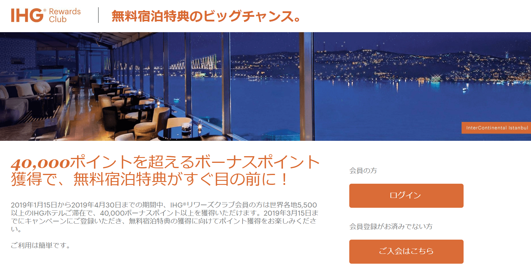 本キャンペーン(以下「キャンペーン」)は、IHG®Rewards Club(以下「IHG®リワーズクラブ」)会員の方のみを対象としており、ご利用には事前の会員番号のご登録が必要です。ご登録(定義は以下をご覧ください)いただいた方には本キャンペーンのキャンペーン特典の条件が提示され、全キャンペーン特典の条件を達成した際に、40,000ポイント以上のボーナスポイント獲得の機会が与えられます。2019年3月15日までのキャンペーン登録が必要です。「ワンクリック登録」をクリックすることで、本キャンペーンへのご登録、IHGリワーズクラブからのお知らせの受け取り、およびキャンペーンご利用規約ならびにプライバシーに関する方針に同意したものとみなされます。会員の方がキャンペーンで提供される各キャンペーン特典(以下「キャンペーン特典」)の要件を満たすことにより、各キャンペーン特典に表示されているボーナスポイントが付与されます。2019年1月15日から2019年4月30日(両期日を含む)の期間中に各キャンペーン特典を達成する必要があります(以下「登録」)。