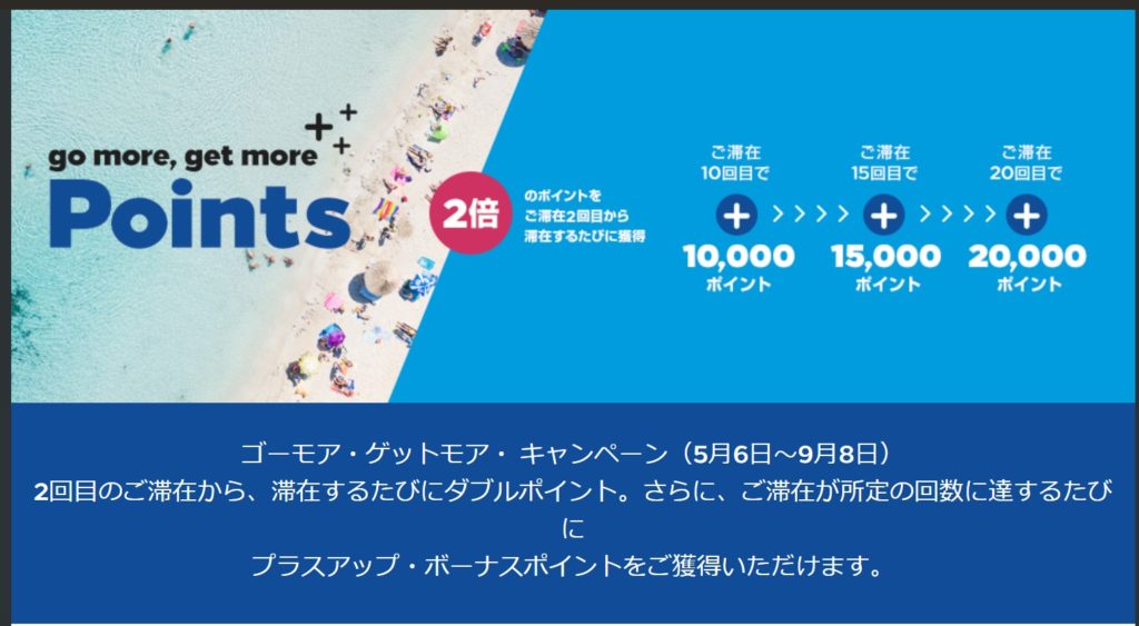 ・さらに滞在10回を完了後に追加で10,000ボーナスポイント、もう5回の滞在(合計15泊)を完了後に15,000ボーナスポイント、もう5回の滞在(合計20泊)を完了後に20,000ボーナスポイント