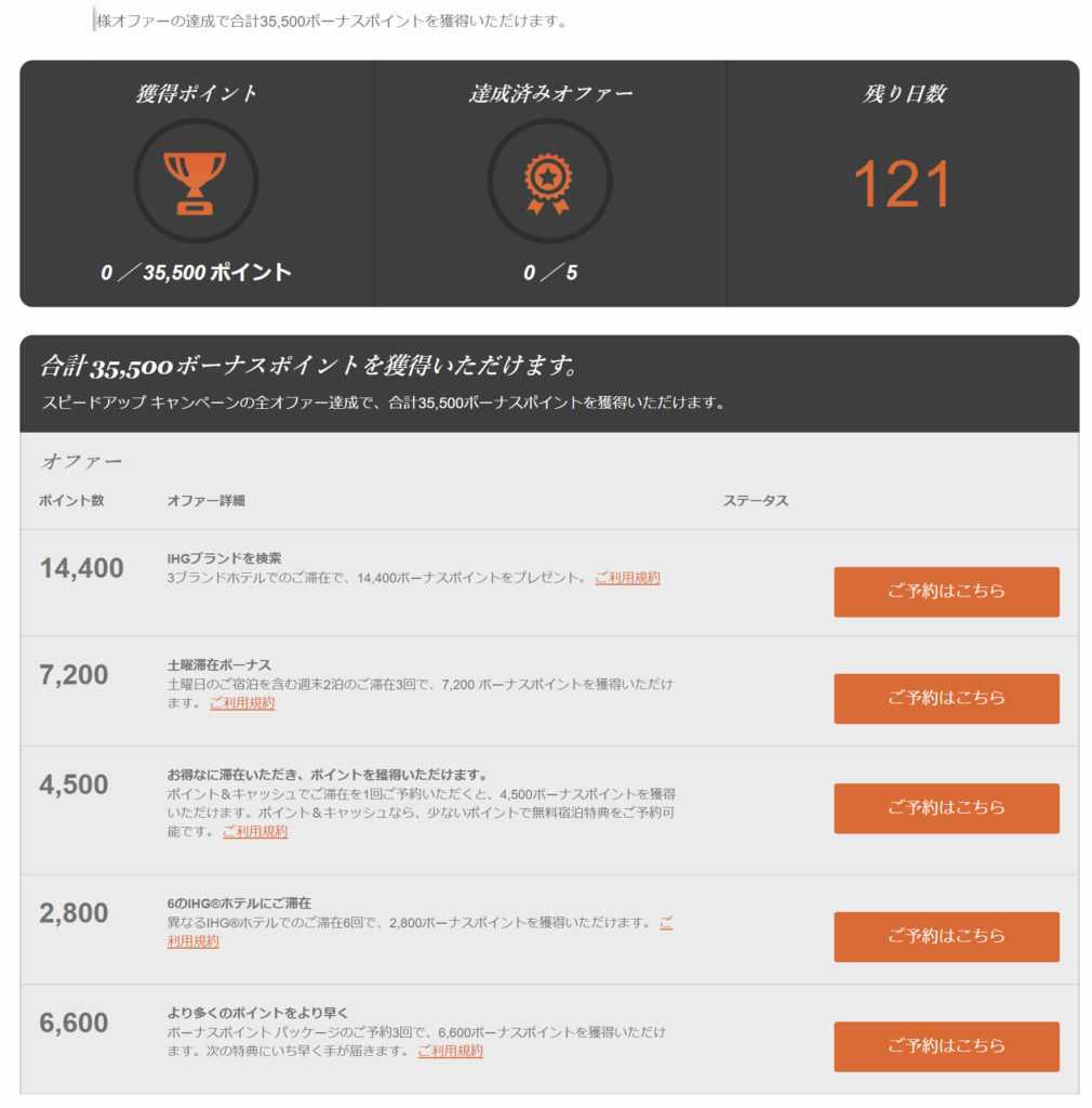 IHGの「スピードアップキャンペーン」は、いくつかのお題(オファー)があり、そのお題をクリアーするごとにポイントが付与されるものです。 与えられるオファーは人によって違いますし、すべて達成した時のポイントも大きく違います。