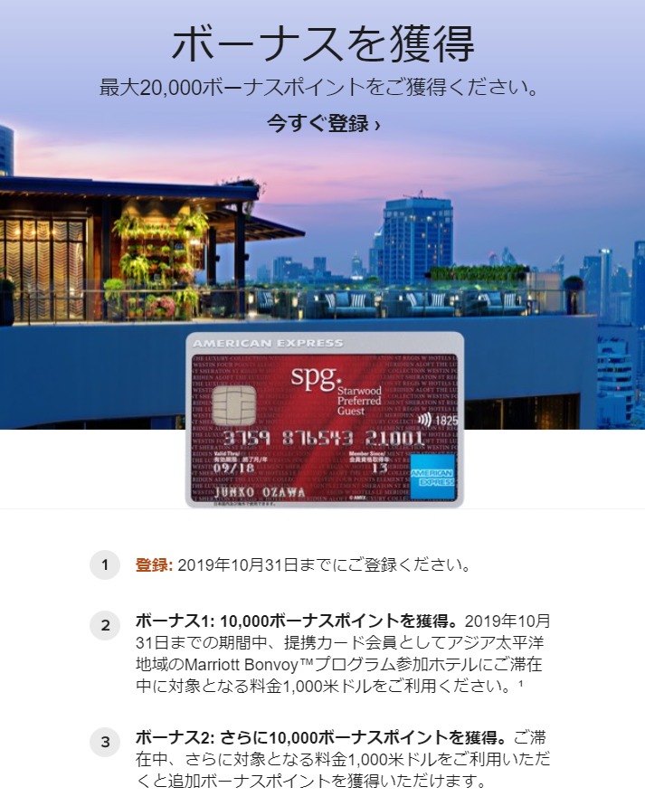 2019年スターウッド プリファード ゲスト® アメリカン・エキスプレス®・カード会員限定ご滞在料金プロモーション (「プロモーション」) の登録期間は2019年8月1日 (木) から10月31日 (木) (「登録期間」) まで、アジア太平洋地域のMarriott Bonvoyプログラム参加ホテルおよびリゾート (「プログラム参加施設」) でのご滞在期間は2019年8月1日 (木) から10月31日 (木) (「獲得期間」) までです。対象となる会員 (以下に定義) は獲得期間中の利用料金1,000米ドルにつき10,000ボーナスポイントを、最大20,000ボーナスポイントまで獲得できます (「ボーナスポイント」)。当プロモーションのボーナスポイント獲得の対象となる利用料金は、獲得期間中、プログラム参加施設での滞在中に発生した、対象となる会員のご宿泊明細書に記載された対象となる料金 (「対象となる料金」) を指します。対象となる料金の例は以下をご覧ください。