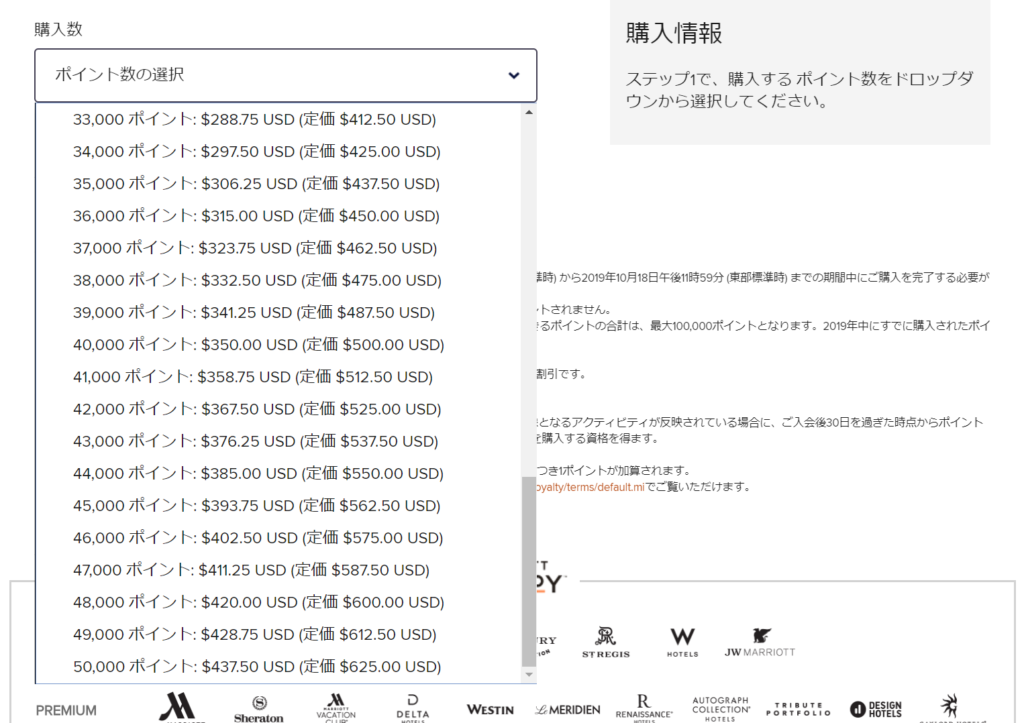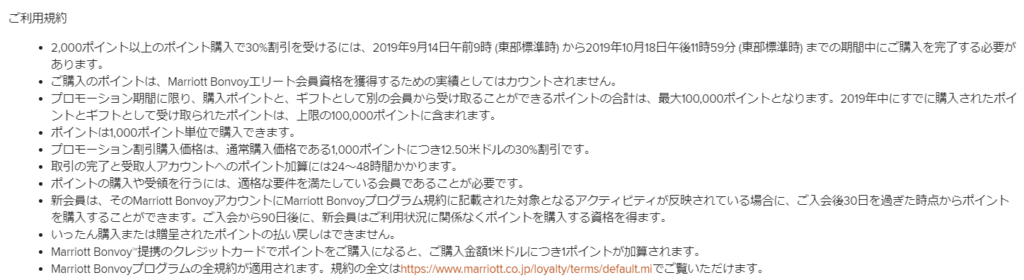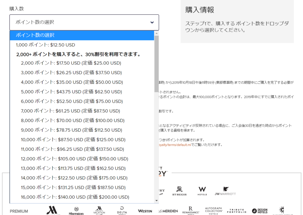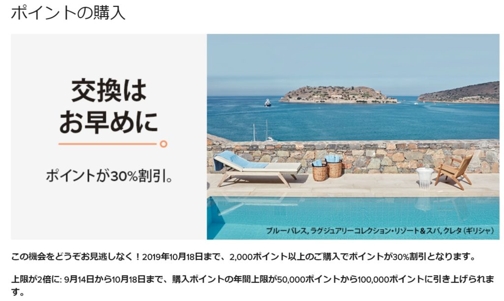 大量のバイマイルが可能で非常に人気が高かったのですが、2018年8月にSPGとマリオットが統合したあとはしばらくの間セールは行われていませんでした。マリオットは統合前にポイントセールを行っていませんでしたので、セールがあるか心配していましたが2019年4月統合後初のポイント購入25%割引セールが行われました。今回はそれを上回る30%割引セールが行われています