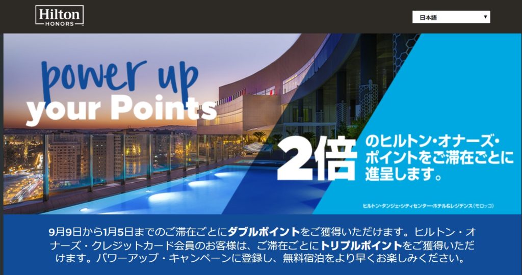 ヒルトンでは滞在ポイントが2倍(ヒルトン・オナーズ・クレジットカード利用で3倍)となるキャンペーンを行っています。