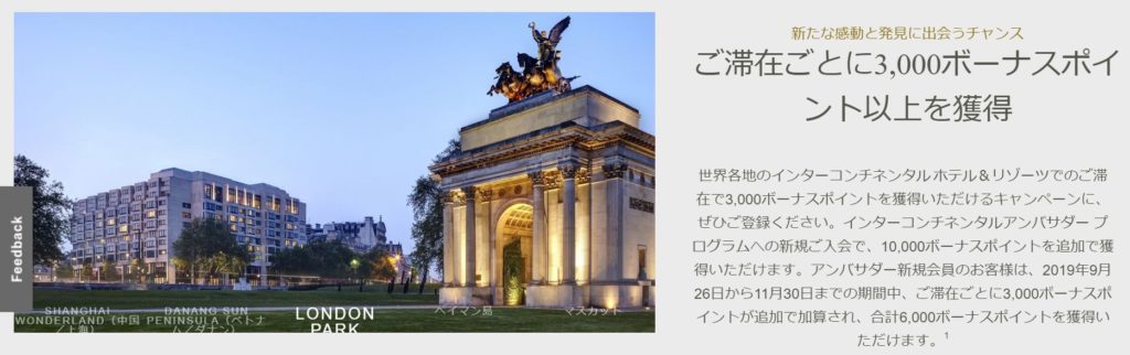 2019年9月11日から2019年11月30日までの間にインターコンチネンタルアンバサダーに新規入会した場合、滞在毎に3000ポイントが付与されます。上記の3000ポイントが付与されるキャンペーンと合計できますので、要するに滞在毎に6000ポイントが付与されることになります。