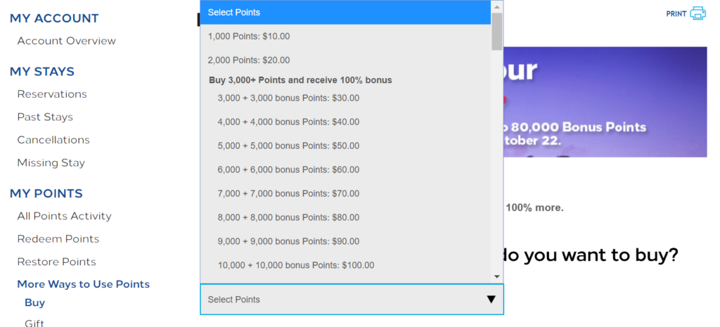 IHGのポイント購入のセールは100%ボーナスが最大です。また、IHGのポイントは26000ポイント以上を購入すると最安となります。