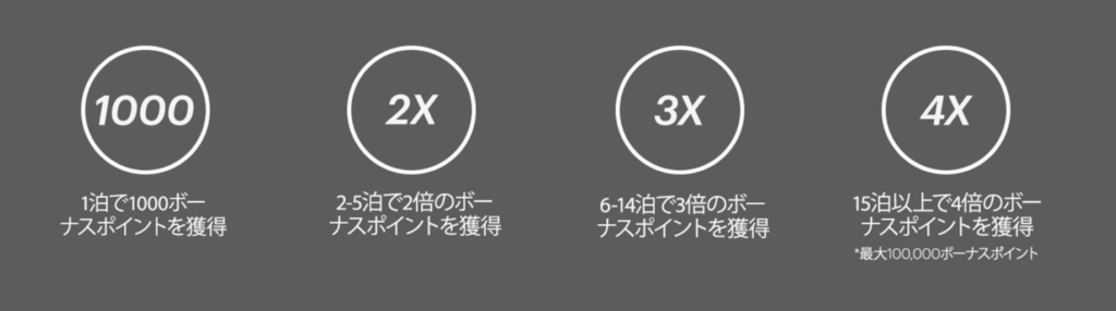 2020年1月31日まで行われていたUp To 4X ボーナスポイントキャンペーンは1滞在目:1000ポイント、2滞在目:ポイント2倍、3滞在目:ポイント3倍、4滞在目以降:ポイント4倍という大盤振る舞いでしたが、「滞在」が「宿泊」になり4倍ポイント獲得のハードルがあがりました。まぁ前回のキャンペーンが大判振る舞いすぎたのでしょう