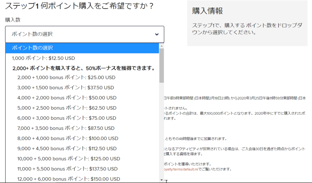 ポイントは、1,000ポイントにつき12.50米ドルで購入できます。