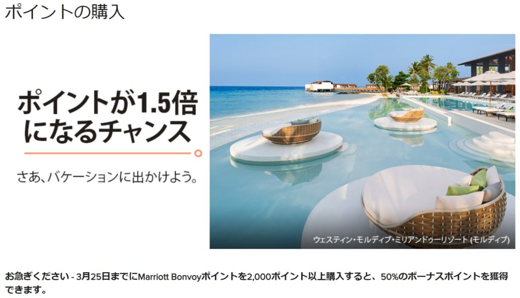 大量のバイマイルが可能で非常に人気が高かったのですが、2018年8月にSPGとマリオットが統合したあとはしばらくの間セールは行われていませんでした。マリオットは統合前にポイントセールを行っていませんでしたので、セールがあるか心配していましたが2019年4月統合後初のポイント購入25%割引セールが行われました。その後2回ほど30%割引セールが行われていましたが、今回は初の50%増量セールとなります。