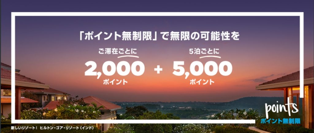 ヒルトンでは滞在ごとに2,000ポイントを無制限で、さらに5泊ごとに5,000ポイントを獲得できるキャンペーンを行っています。