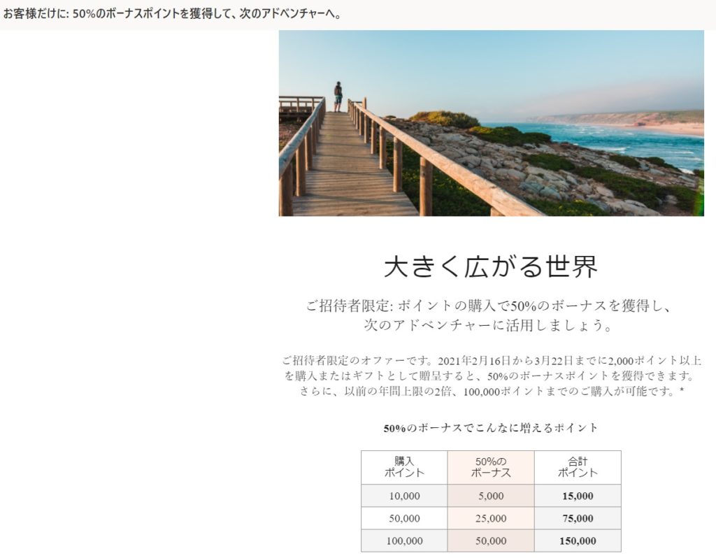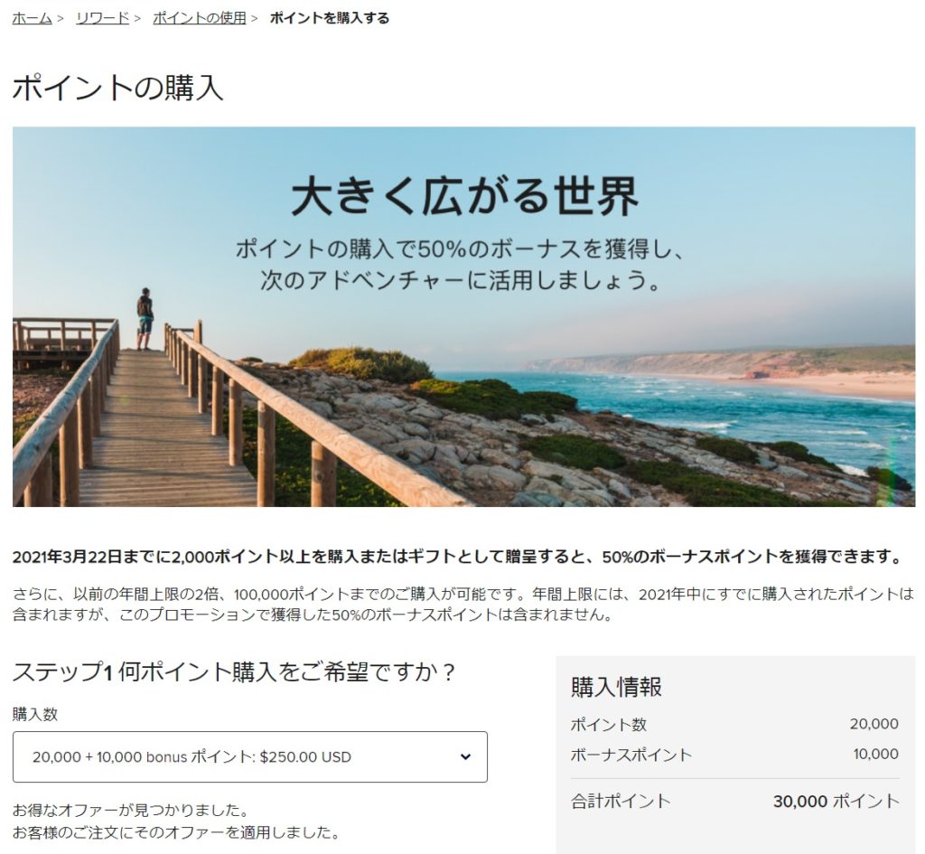 ・会員は合計で最大100,000ポイントまで購入するか、ギフトとして別の会員から受け取ることができます。2021年中にすでに購入されたポイントとギフトとして受け取られたポイントは、年間購入上限の100,000ポイントの一部として計上されます。このプロモーションで獲得した50%のボーナスポイントは、年間購入上限の100,000ポイントの制限の対象外です。