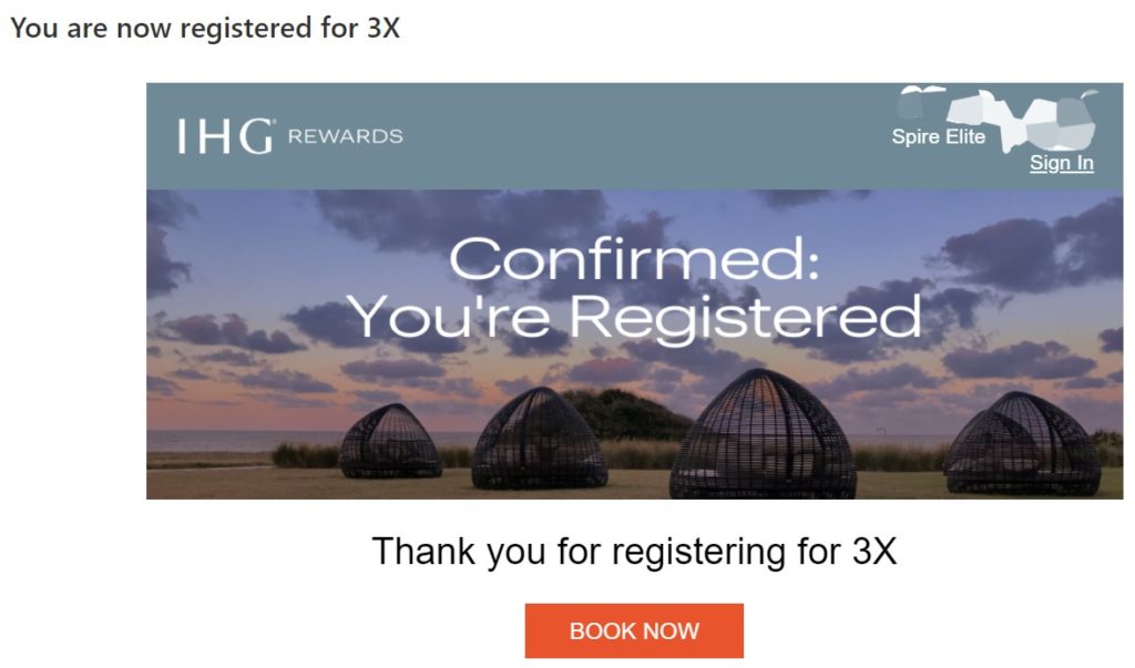You must be an IHG® Rewards member and must register your member number in advance of staying, to participate in the “3X” promotion (“Promotion”). Members can pre-register for this Promotion starting September 15, 2021 through September 30, 2021. Members will be able to register, stay, and earn for this Promotion beginning October 1, 2021 and ending on December 31, 2021 (“Promotion Period”). Upon registration, members will be presented with the opportunity to earn 2X points upon completion of their second qualifying stay, and then 3X points completion of their third qualifying stay and all subsequent qualifying stays, during the Promotion Period when paying a Qualifying Rate (as such rates are defined in the IHG Rewards terms and conditions). For the Promotion, earning “2X” or “2X points” or “double points” on a 2nd qualifying stay means the member will receive two (2) times the “base points” the member would normally receive just for being an IHG® Rewards Club member. For example, under the Promotion, for a one-night second (2nd) qualifying stay at a rate of $100.00, the member would earn 1,000 base points (10 points per USD x $100 = 1,000 points) and an additional 1,000 promotional bonus points, for a total of 2,000 points. For the Promotion, earning “3X” or “3X points” or “triple points” on a 3+ qualifying stay means the member will receive three (3) times the base points on their 3rd qualifying stay, and all subsequent qualifying stays. For example, for a one-night third (3rd) qualifying stay at a rate of $100.00, the member would again earn 1,000 base points (10 points per USD x $100 = 1,000 points) and then an additional 2,000 promotional bonus points, for a total of 3,000 points. The promotional bonus points under this Promotion are calculated based solely on the base points the member is eligible to earn for a qualifying stay just for being an IHG® Rewards Club member, and any Elite status bonus points or any other bonus or promotional points the member may be eligible to receive for the same stay are not included. You must register, book, and stay on or before December 31, 2021 to earn points during the Promotion Period.
