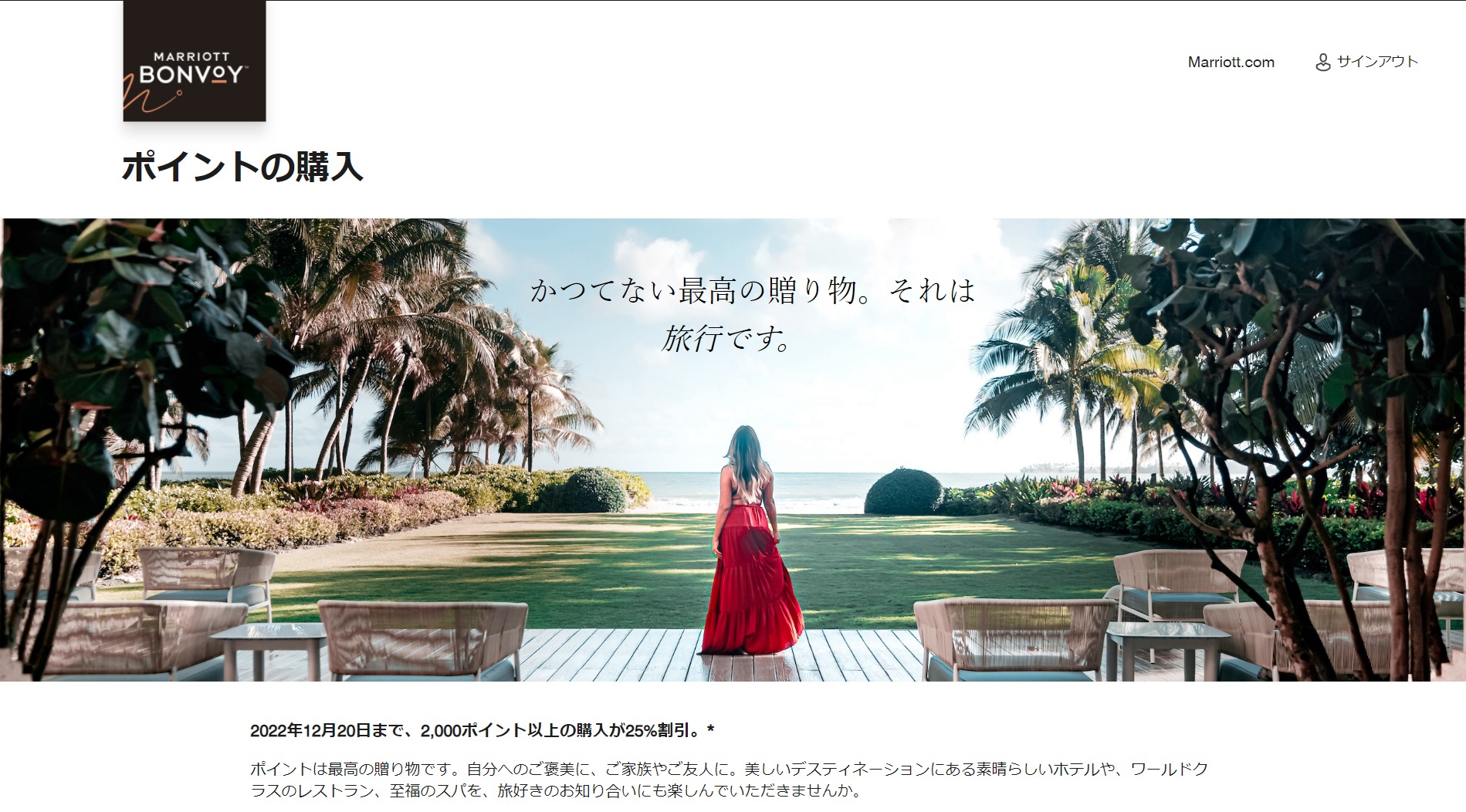 ・2022年、会員は、マリオットのウェブサイトの「ポイントを購入」および「ポイントを贈る」ページ (当サイトを含む)、Points.comによる「ポイントを購入する」ウィンドウ、マリオットモバイルアプリ、またはカスタマーエンゲージメントセンターを通じて購入された場合、1暦年に合計100,000ポイントまで、ポイントを購入またはギフトとして受け取ることができます。