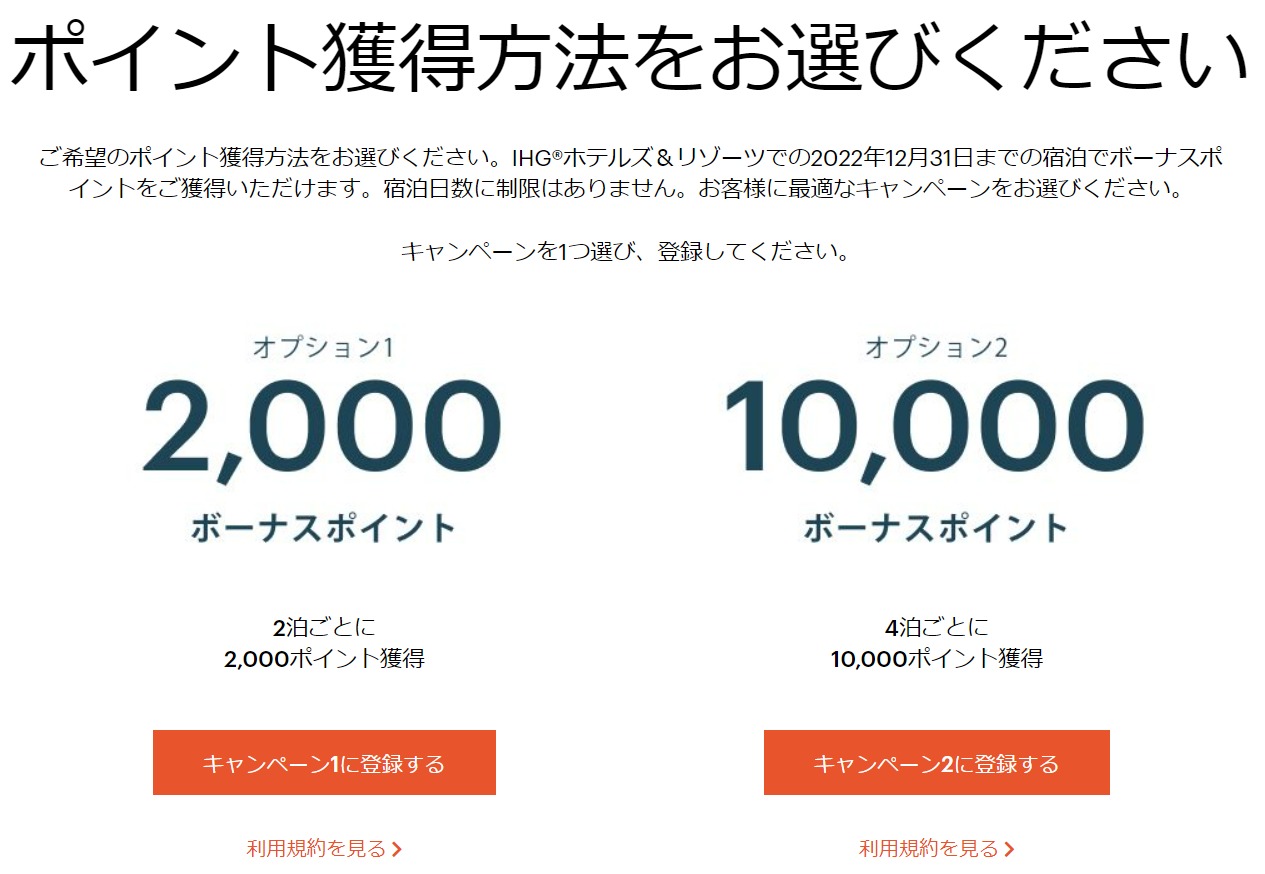 *本キャンペーン(以下「キャンペーン」)は、IHG One Rewards会員に対し、追加のIHG One Rewardsボーナスポイントを獲得する2つのオプションのいずれかを選択する機会を提供するものです。本キャンペーンに参加するには、有効なIHG One Rewardsアカウントを有する必要があります。会員はまず、次の2つのキャンペーンのいずれかに会員番号を登録する必要があります。(1)「2泊ごとに2,000ポイント獲得」キャンペーン(以下「2,000ポイントキャンペーン」)、(2)「4泊ごとに10,000ポイント獲得」キャンペーン(以下「10,000ポイントキャンペーン」)。2,000ポイントキャンペーンに登録すると、キャンペーン期間中(以下に記載)に加算対象となるご滞在を2泊完了するごとに、IHG One Rewardsボーナスポイントを2,000ポイント獲得できます。10,000ポイントキャンペーンに登録すると、キャンペーン期間中に加算対象となるご滞在を4泊完了するごとに、IHG One Rewardsボーナスポイントを10,000ポイント獲得できます。会員が登録できるのは2つのキャンペーンのうち1つのみであり、登録後はそのキャンペーンのみが対象となります。もう一方のキャンペーンに登録したり、もう一方のオファーに基づいてポイントを受け取ったりすることはできません。