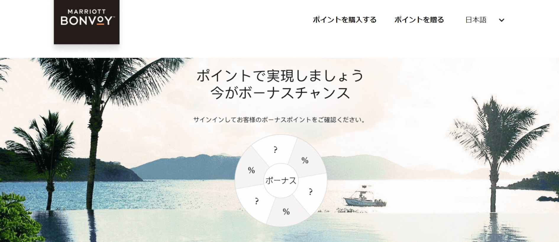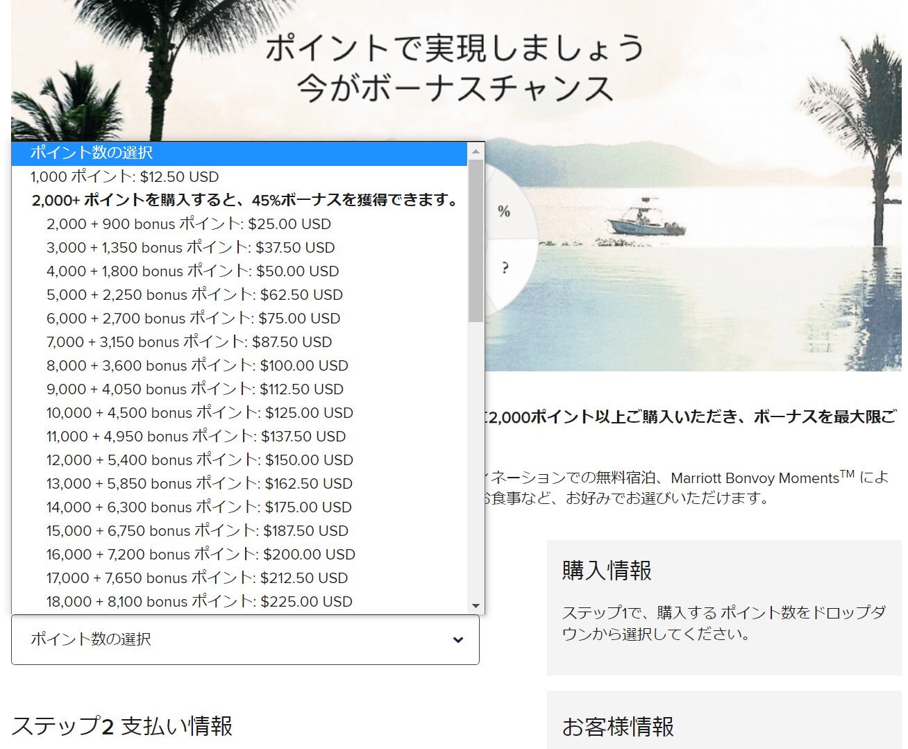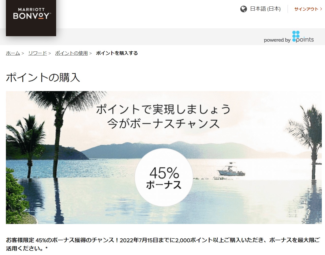・2,000ポイント以上のポイント購入でボーナスポイントを獲得するには、日本時間の2022年6月1日22時から2022年7月16日12時59分 (米国東部時間2022年6月1日9時から2022年7月15日23時59分) までにご購入を完了していただく必要があります。 ・世界各地のMarriott Bonvoy®会員のお客様は、2,000ポイント以上のご購入で45%のボーナスポイント購入オファーの対象となります。