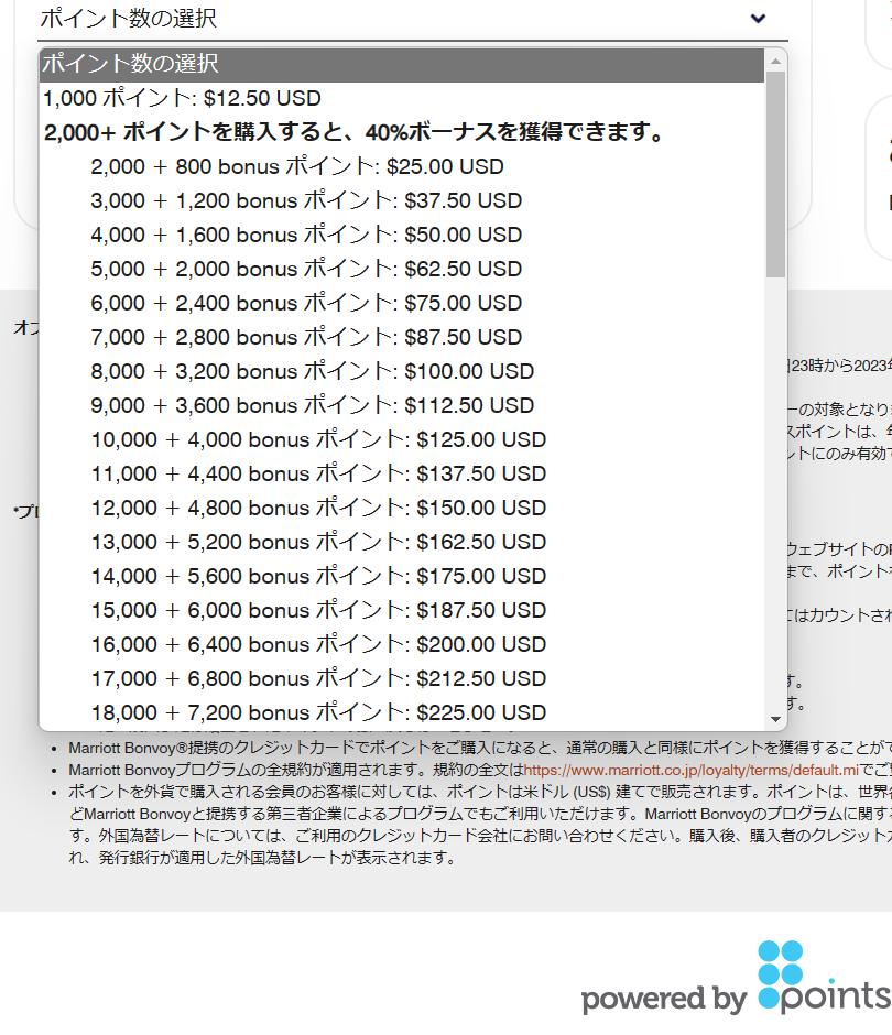 ・ポイントを外貨で購入される会員のお客様に対しては、ポイントは米ドル (US$) 建てで販売されます。ポイントは、世界各地のMarriott Bonvoy参加ホテルでのご滞在はもちろん、マイレージプログラムなどMarriott Bonvoyと提携する第三者企業によるプログラムでもご利用いただけます。Marriott Bonvoyのプログラムに関する詳細はこちらで、ポイントのさまざまな利用方法はこちらでご確認いただけます。外国為替レートについては、ご利用のクレジットカード会社にお問い合わせください。購入後、購入者のクレジットカードの利用明細書には、支払項目の行に購入者の自国通貨で支払い金額が反映され、発行銀行が適用した外国為替レートが表示されます。
