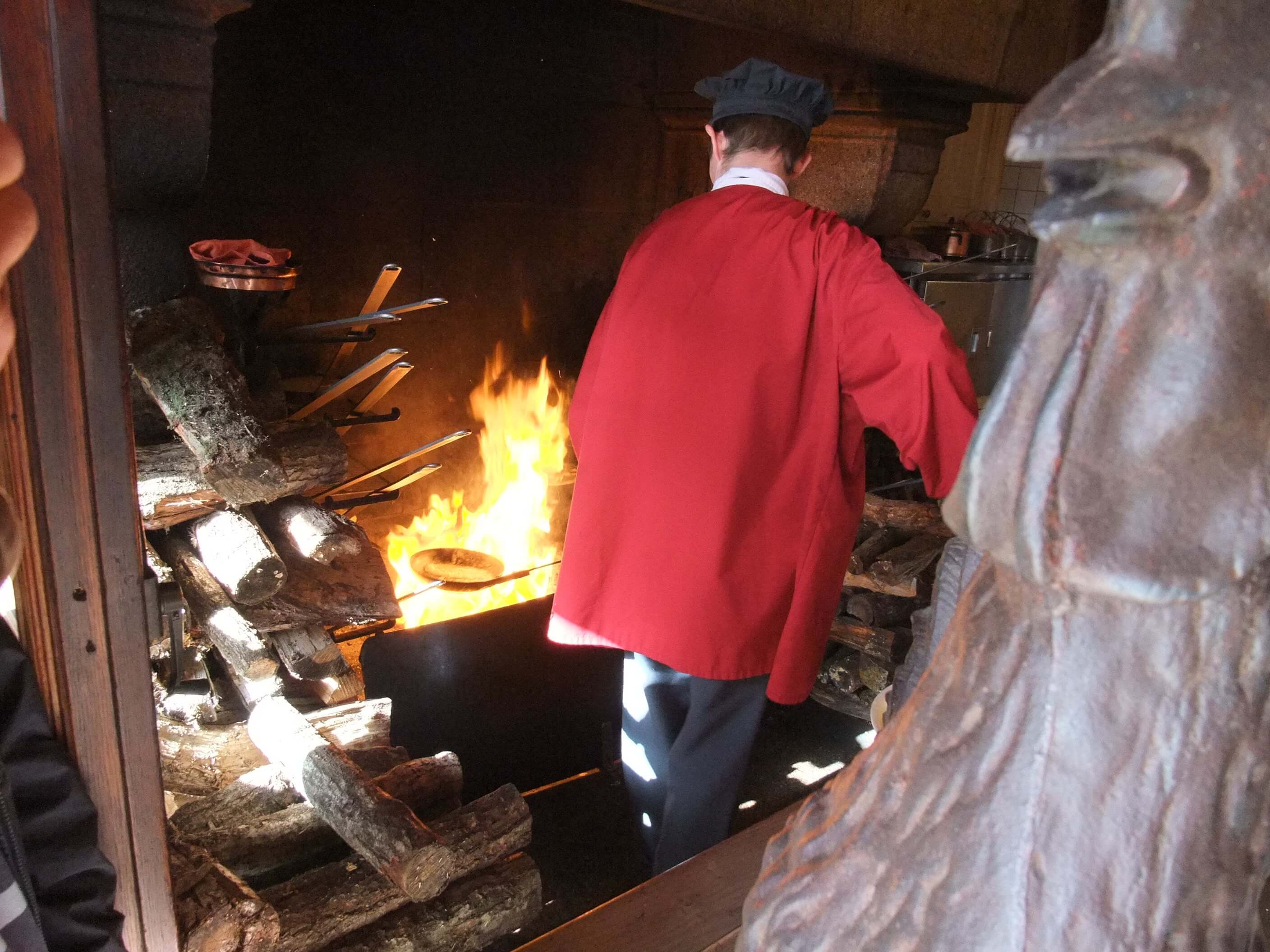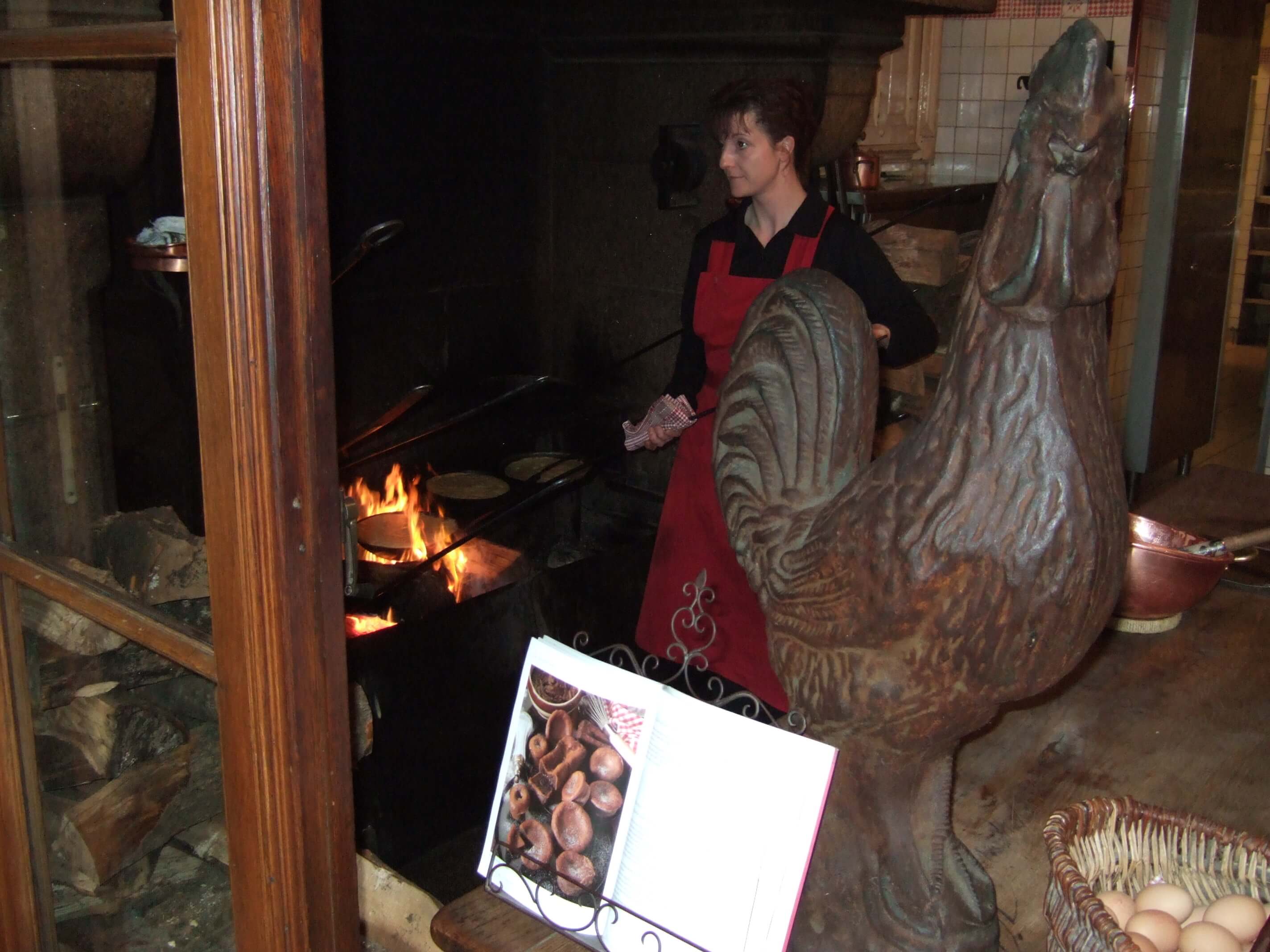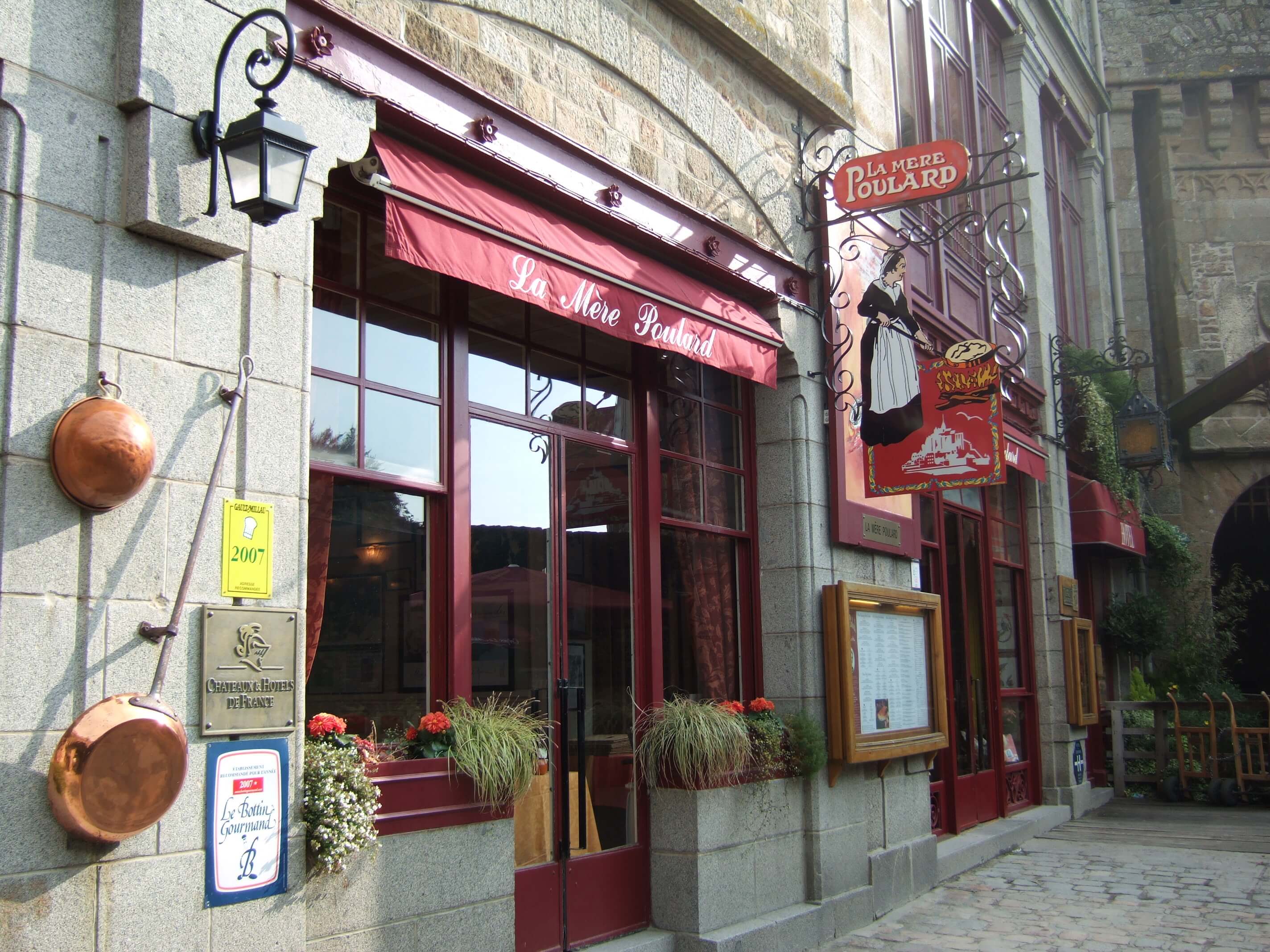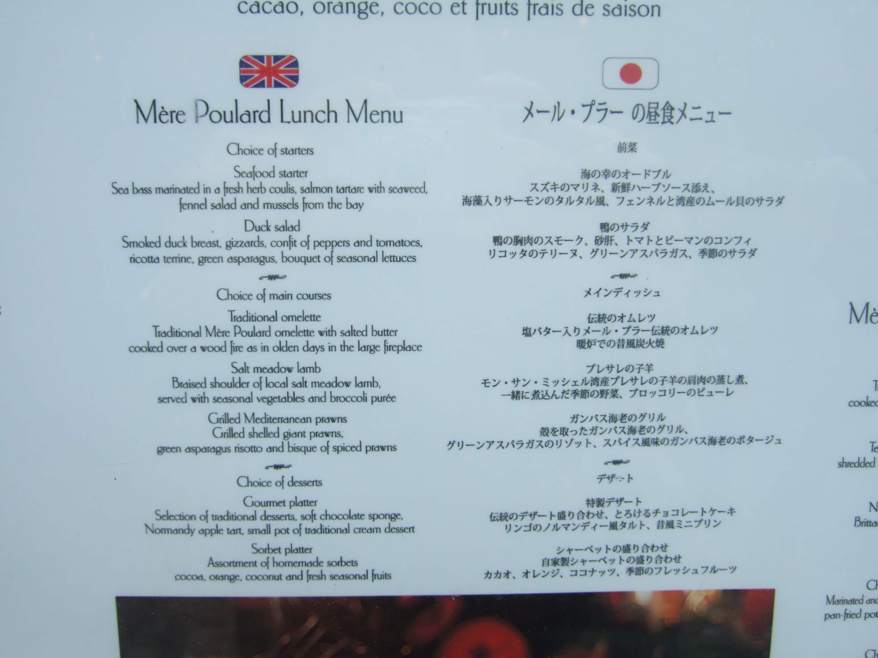 一番有名なプーラールおばさんの店(La Mere Poulard;ラ・メール・プーラール)で食べることにしました。何でもここだけは昔ながらに薪を使ってオムレツを焼いているとのこと(他はオーブンらしい)。店先で卵を泡立て薪を使ってオムレツを焼いているのを実演していました。