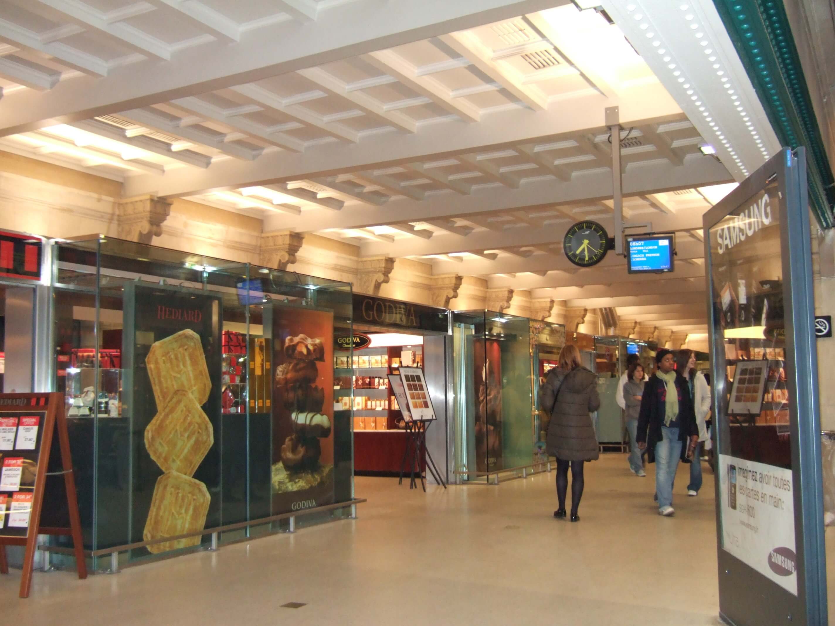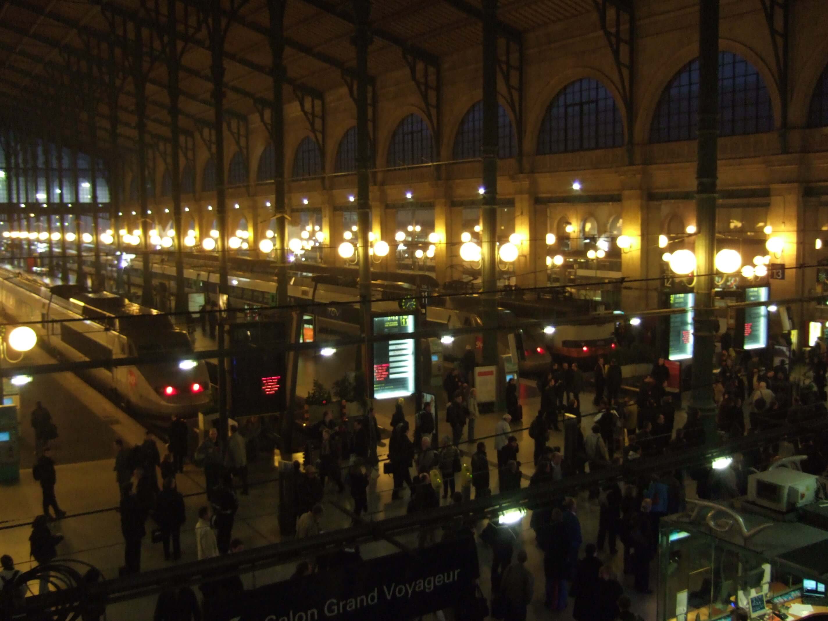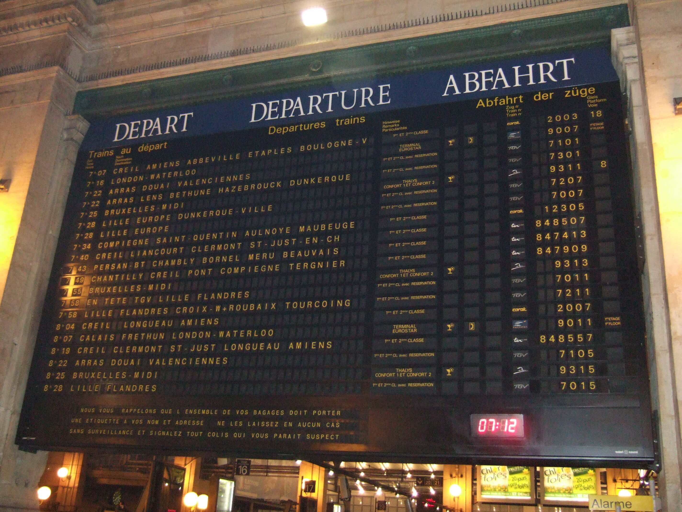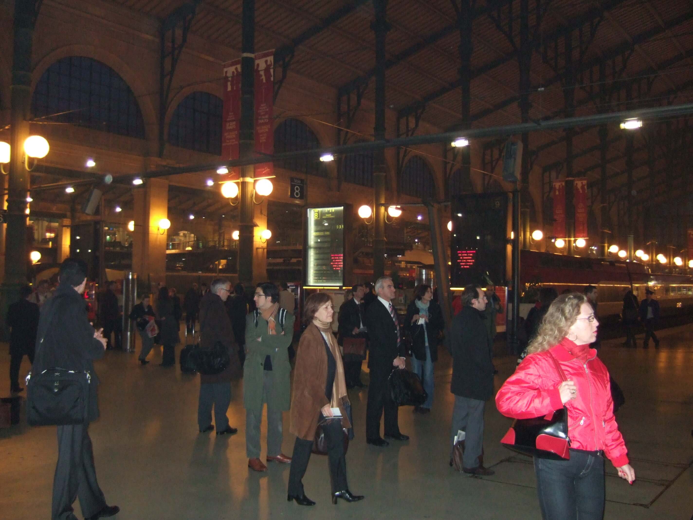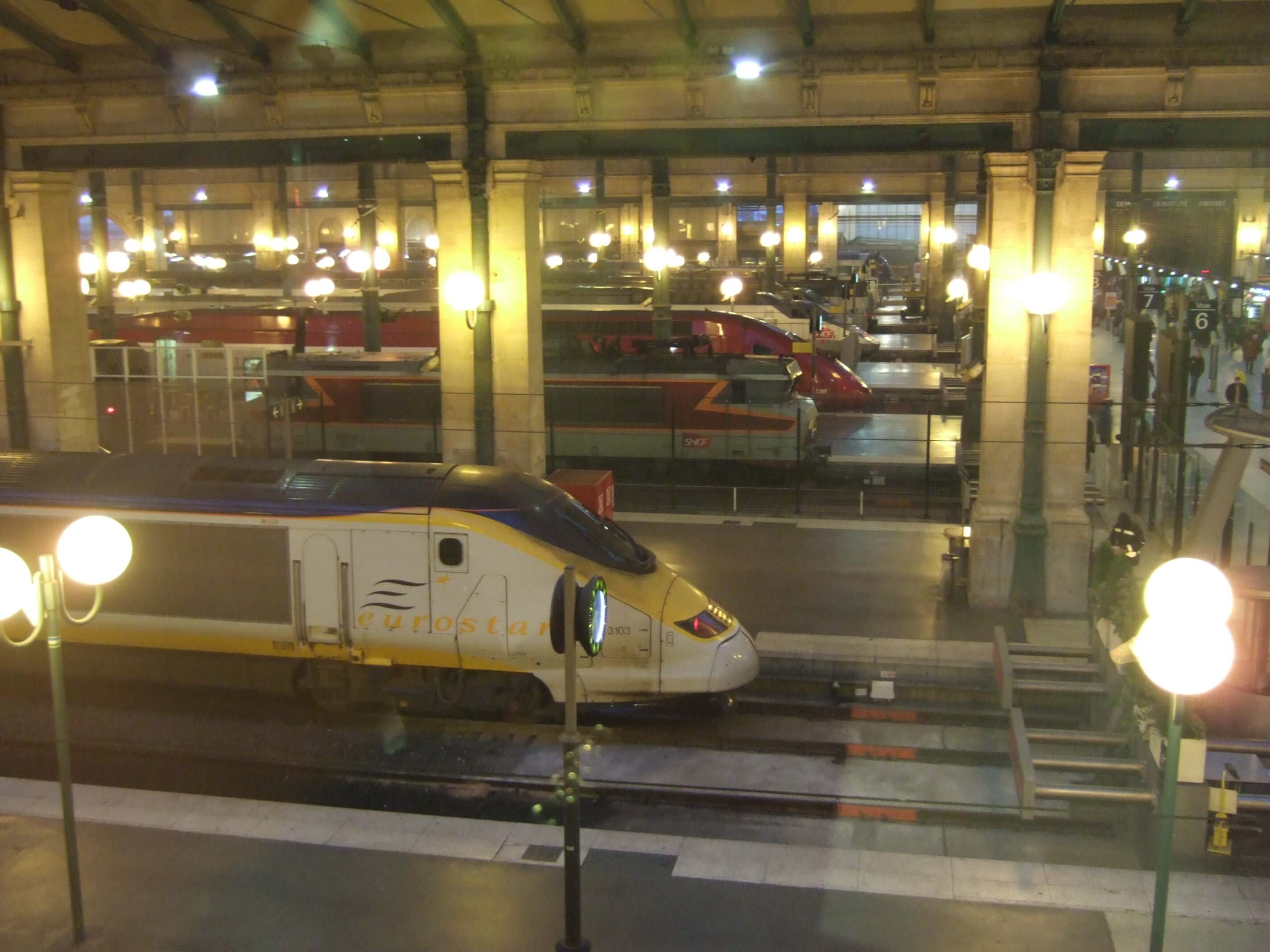 6時40分にホテルを出発し、地下鉄を乗り継いで北駅(Gare de Nord)に7時過ぎに着きました。北駅周辺は治安が悪いとガイドブックなどに書かれていたが、実はこの前日の夜に北駅ではけっこう激しい暴動があったということを日本に帰国してからテレビや新聞で知りました…。外はまだ真っ暗ですがいろんな特急列車の出発駅であるここはとても賑やかでした。