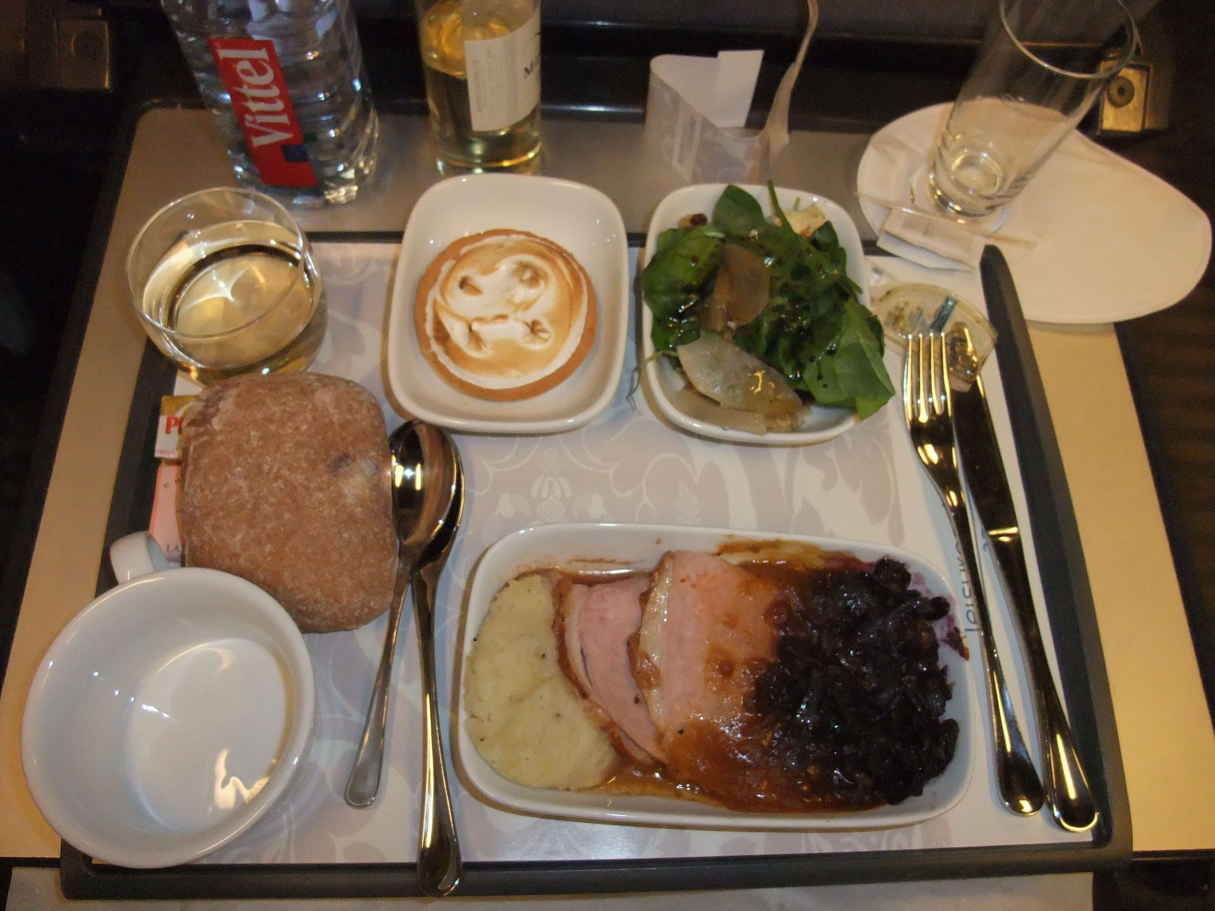 帰りも1列のシートだったが向かい合わせに席があり外人のお姉さんが座りました。ごはん食べるときは何だか気まずかったです。 ディナーは前菜にサーモンとポテトを炒めたものとチーズ、そしてメインはポークステーキか仔牛肉の煮込みでした。僕は仔牛肉の煮込みを選択!イギリス発だったのになぜか英語を話せないクルーで注文するのに苦労しました。結局最後は実物を見せてもらい指差し注文(笑)