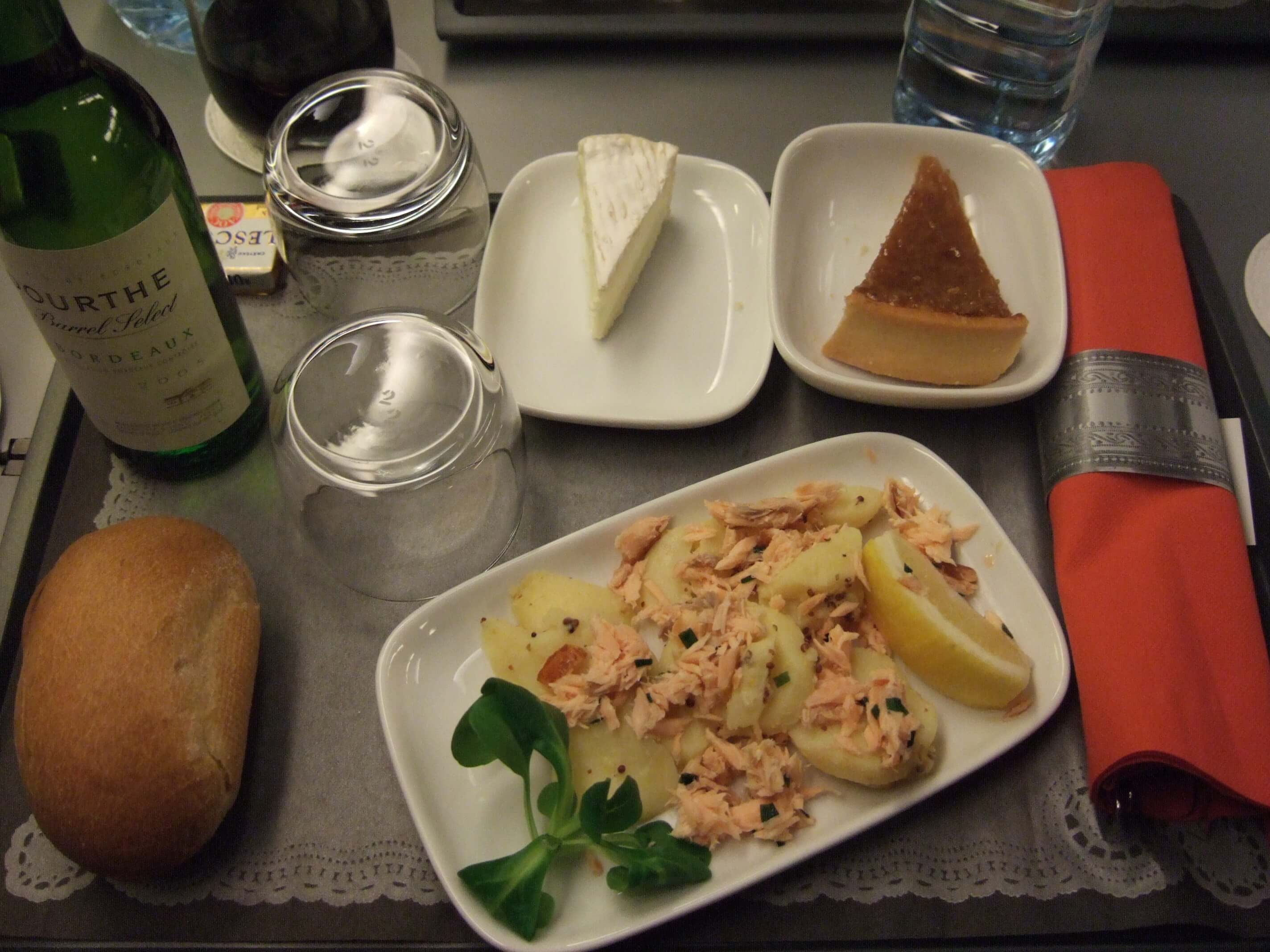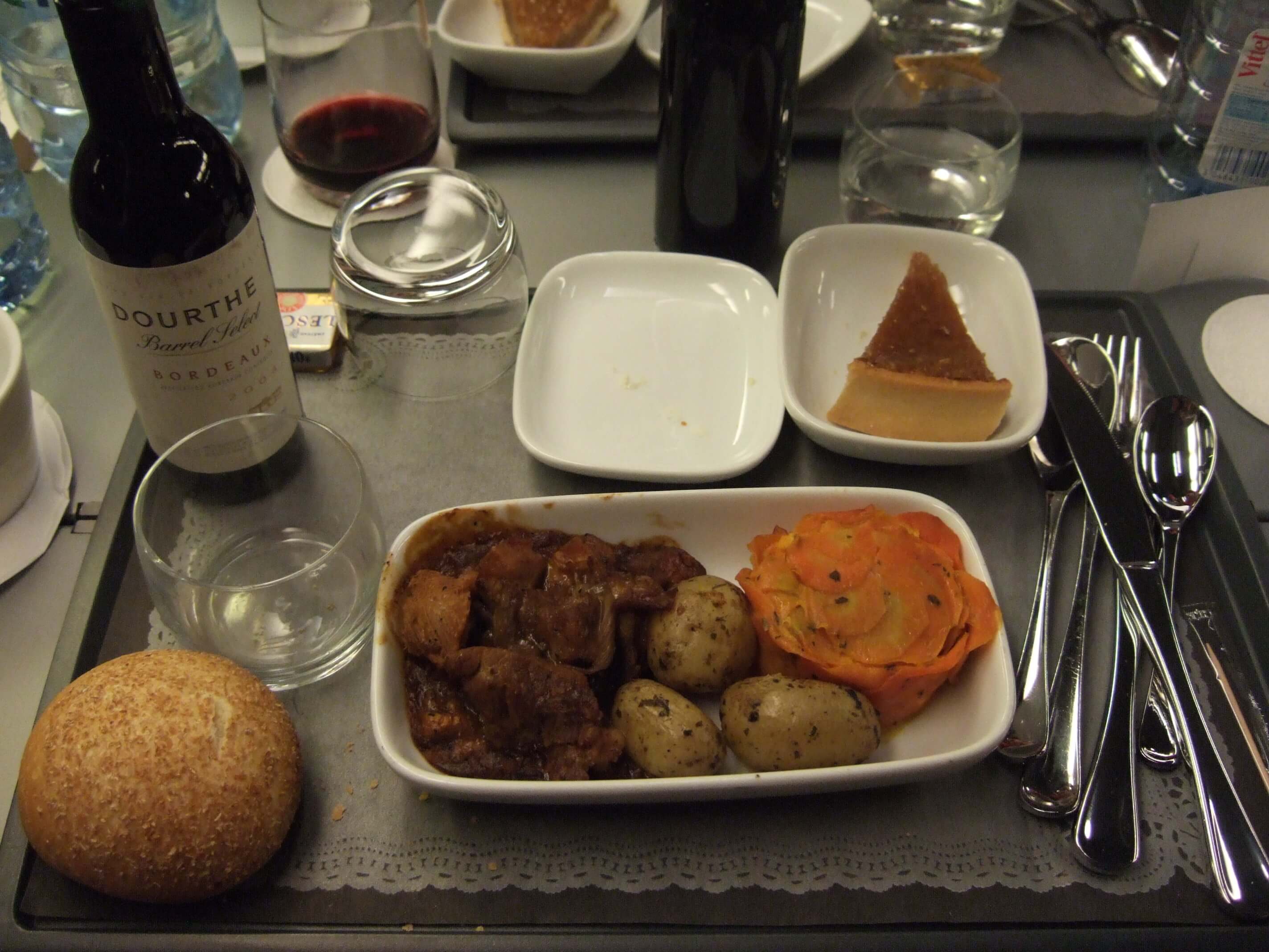 ワインを白と赤の2本を飲み、パンもお代わりして車内でのディナーを堪能!飛行機の機内食よりはかなり美味しかったので満足!