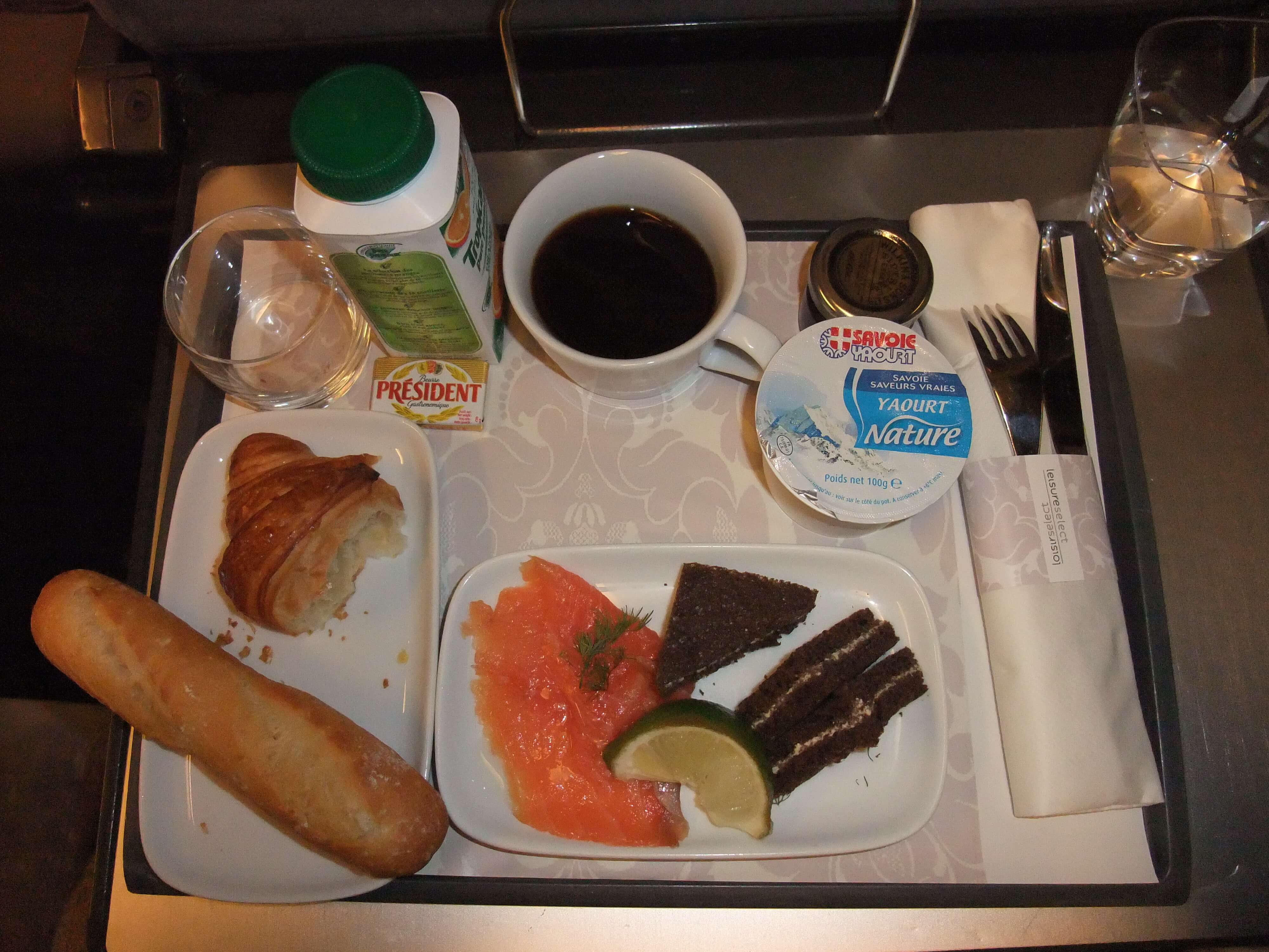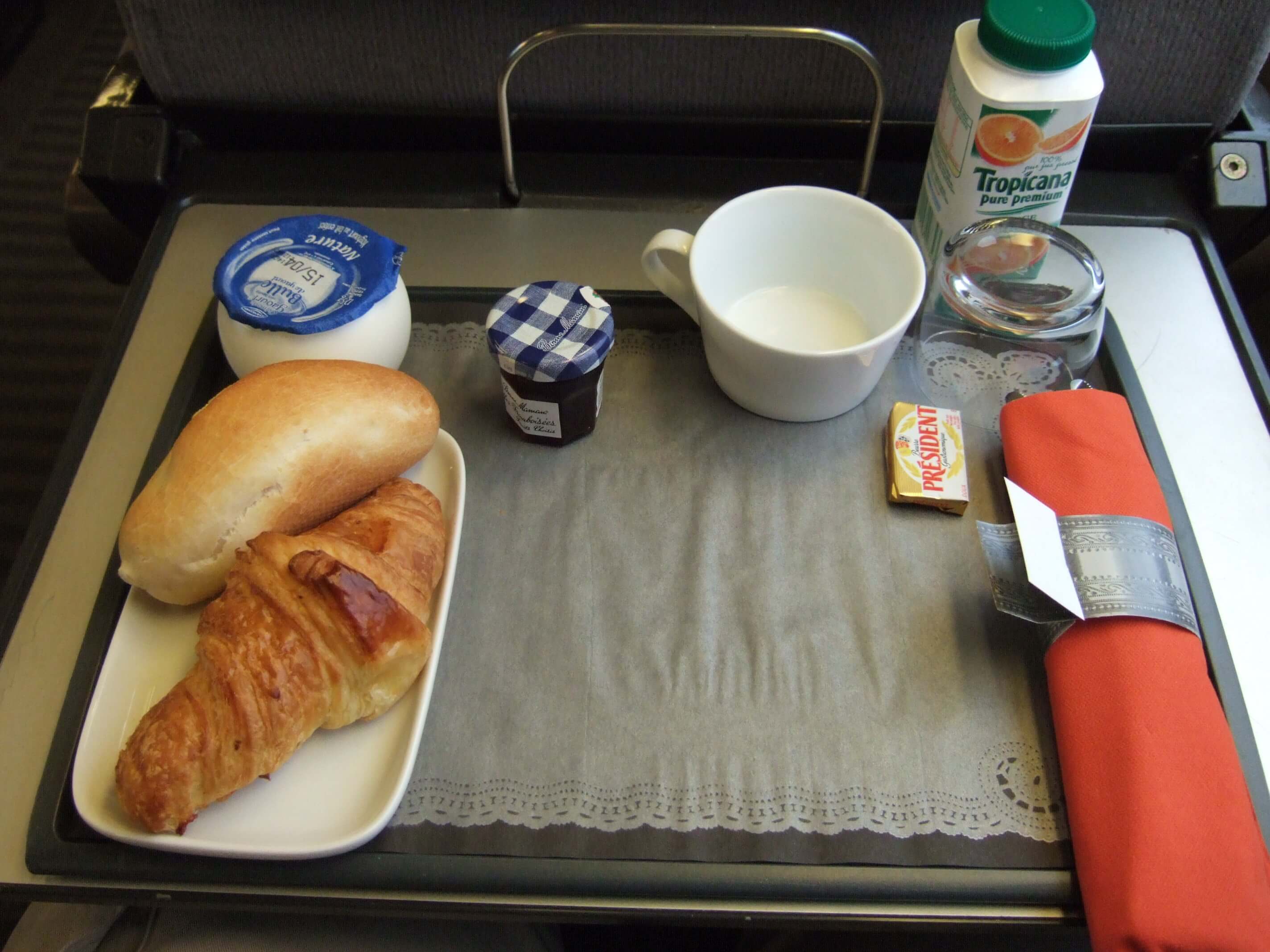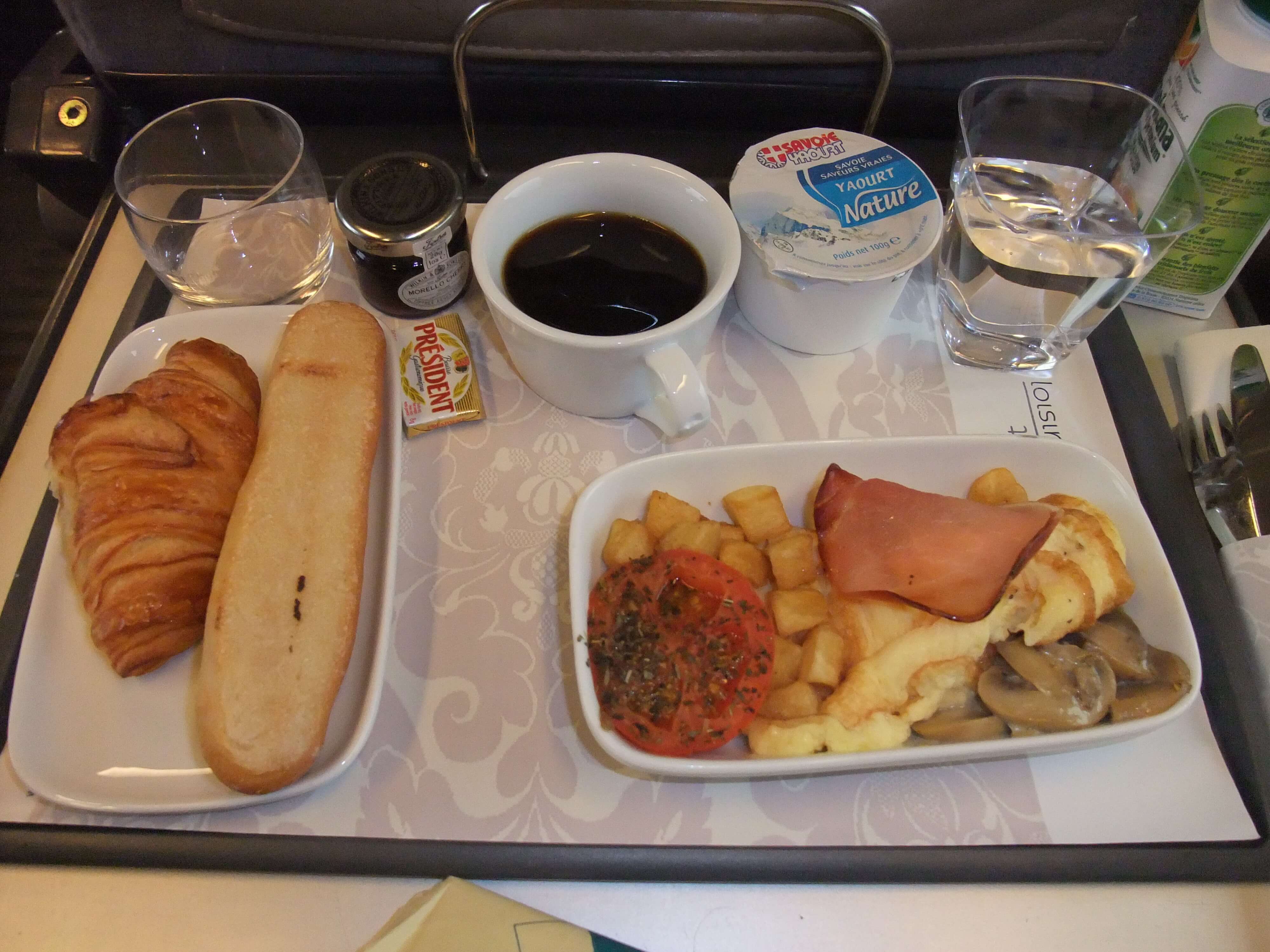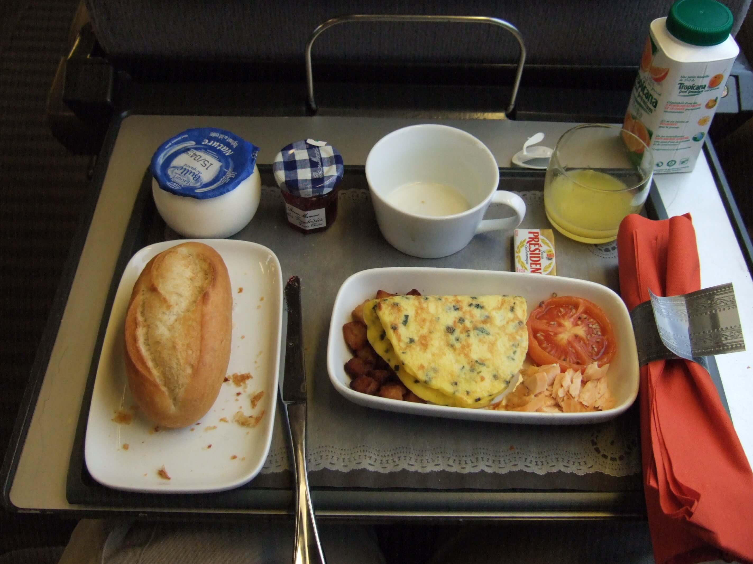 出発してしばらくするとクルーがおしぼりと朝食のメニューを持ってくる。朝食はパン、ヨーグルト、オレンジジュース、ジャムは全員についています。そして 1.オムレツ、トマト、サーモンを焼いてほぐしたもの、ポテト 2.ハム数枚とチーズ の選択でした。