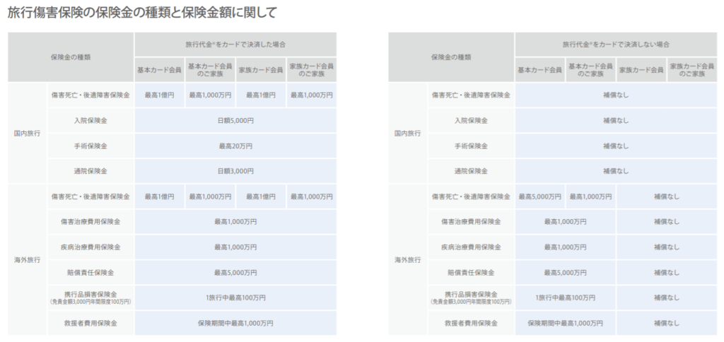 保障金額はプラチナカードの場合以下の通りです(ゴールドカードは保障金額が違いますが内容は変わりません)