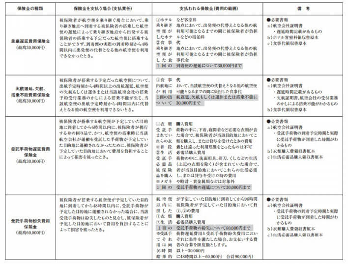 「乗継遅延費用保険金」「出航遅延、欠航、搭乗不能費用保険金」「受託手荷物遅延費用保険金」