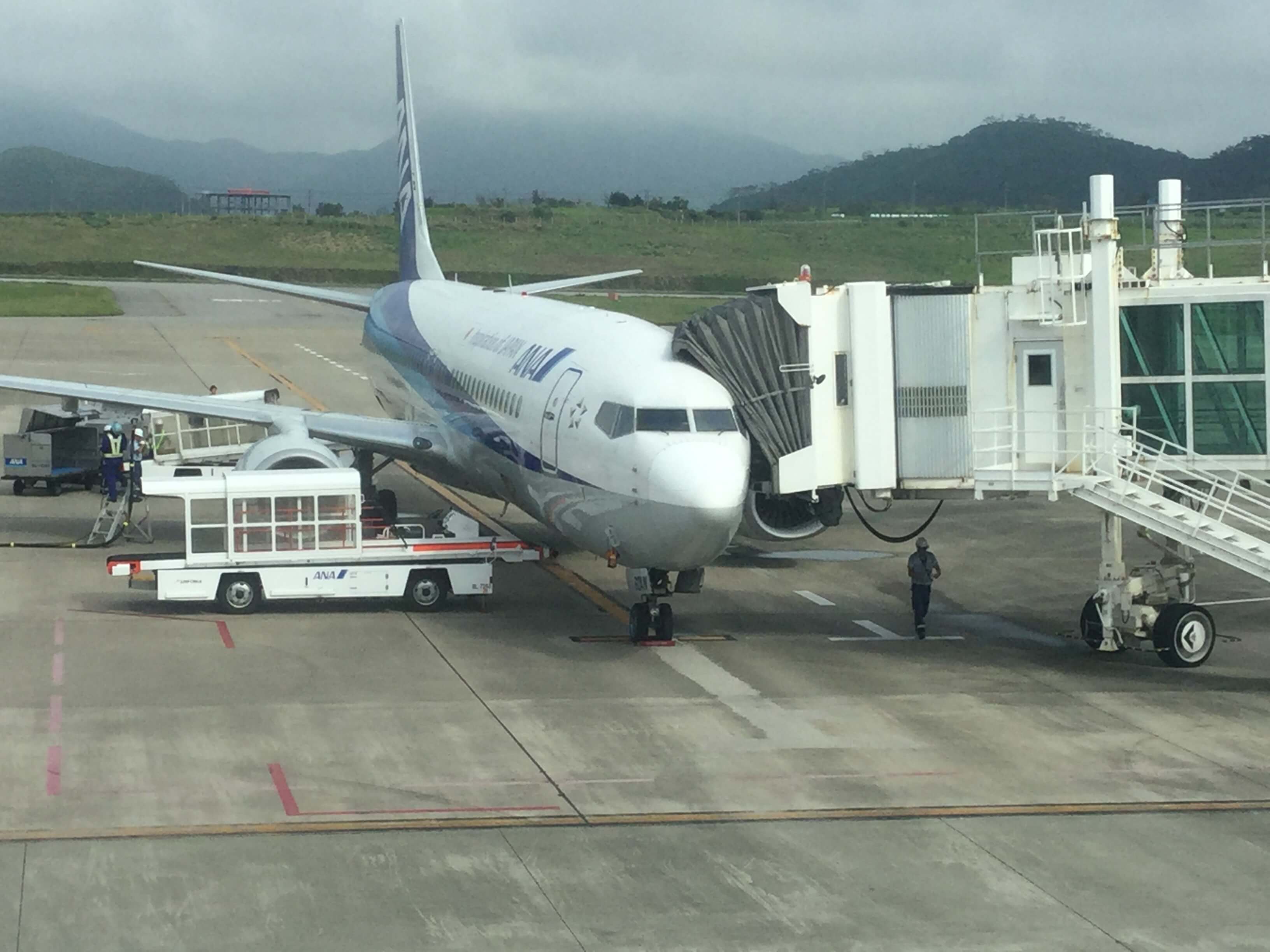 ちょっと時間があるので空港を散策します。展望デッキから乗ってきた飛行機をパシャリ!3月に来た時と比べてちょっと蒸し蒸しして南国らしい暑さを感じられました。