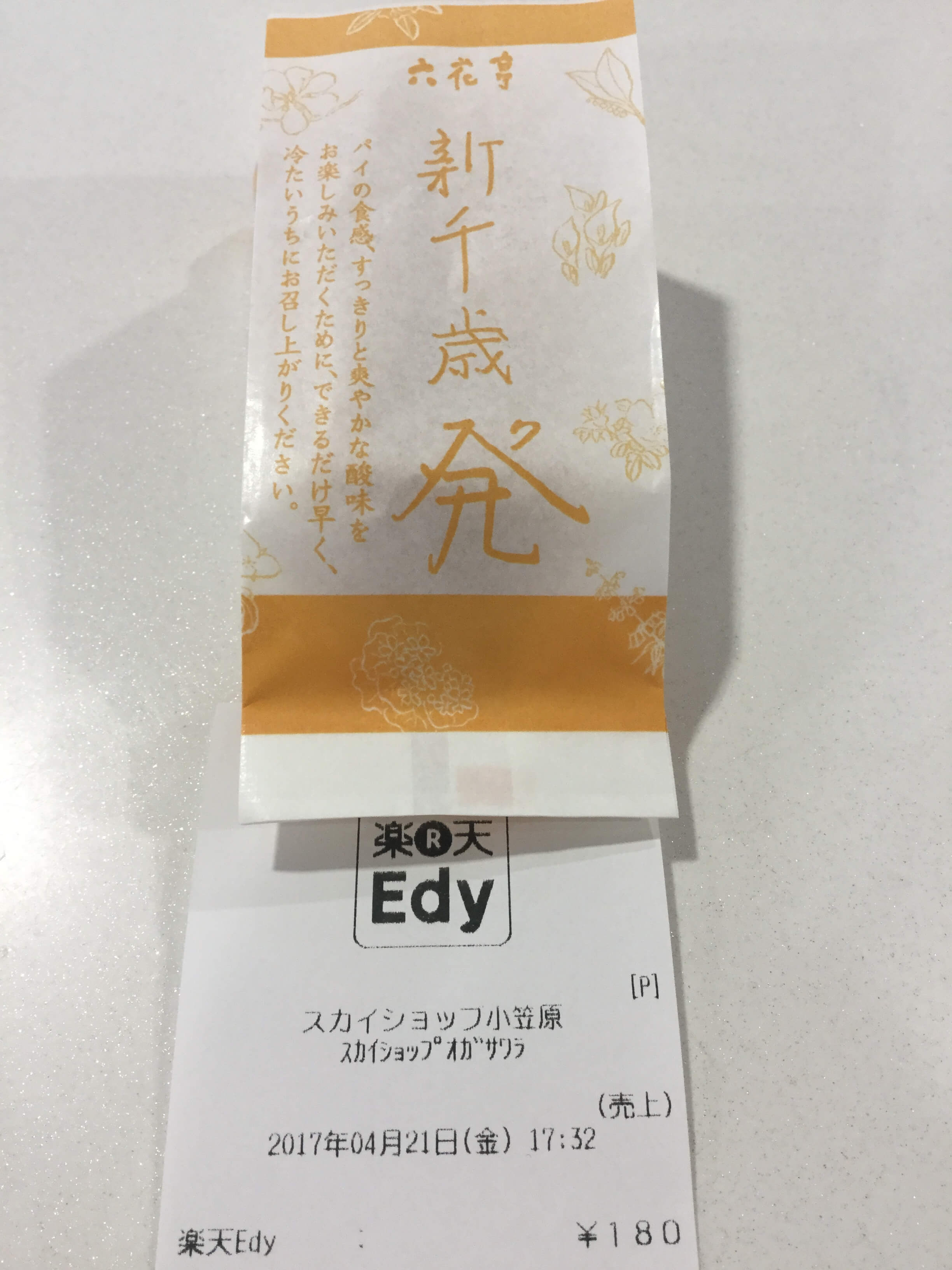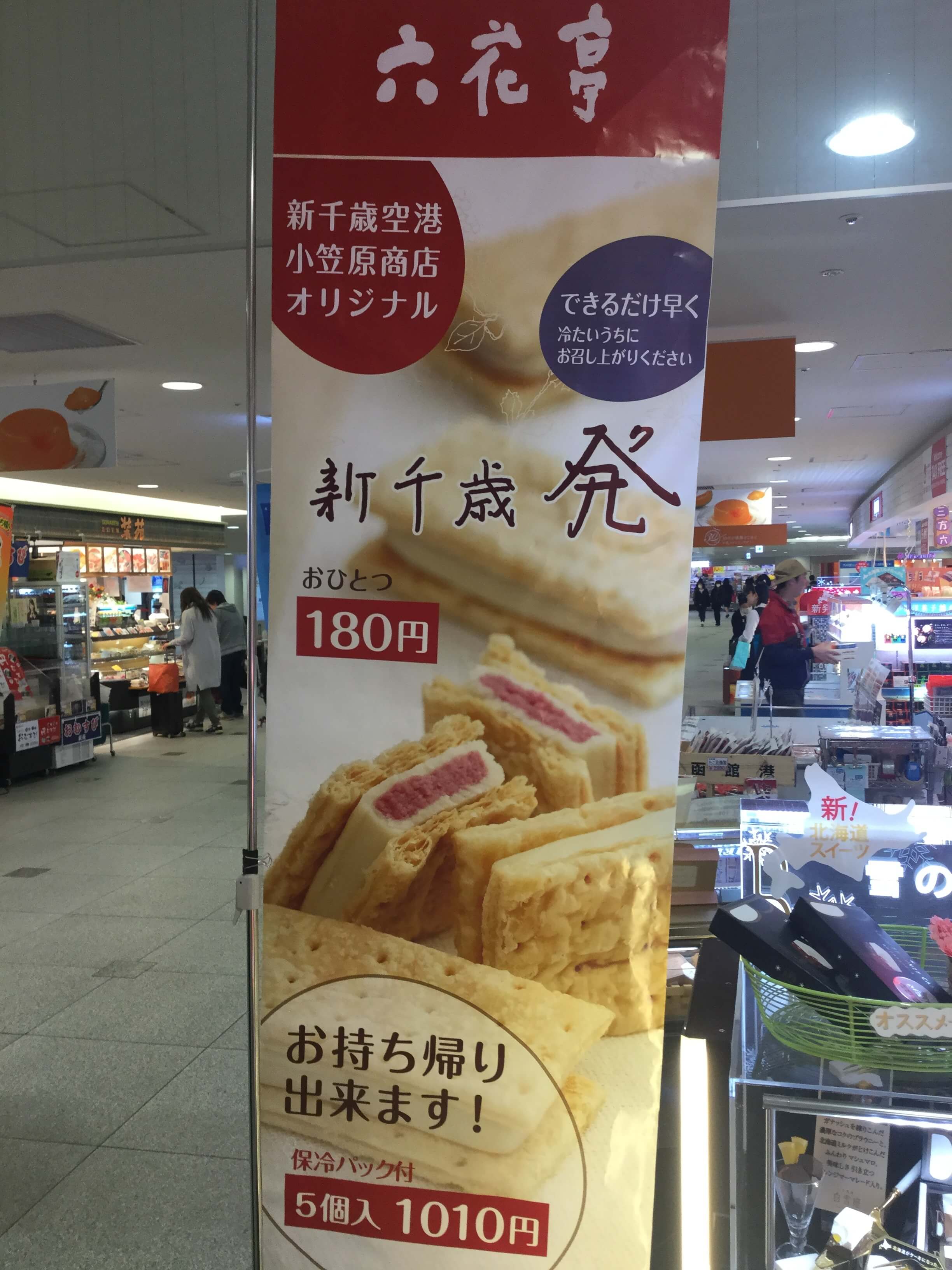 そして、デザートを食べるべく一つ下のフロアに降ります。高校生の修学旅行の時に先生に勧められた六花亭のお菓子を食べてから六花亭ファンである私には外せない食べ物があったのです。それは「スカイショップ小笠原」だけで販売されている新千歳限定の「新千歳発」というお菓子です。 何でも注文してから作るので賞味期限10分と言われているというのです。「スカイショップ小笠原」は見た目は普通のお土産もの屋さんという感じです。六花亭のお菓子だけでなく白い恋人やロイズなど北海道定番のお菓子も並んでいます。