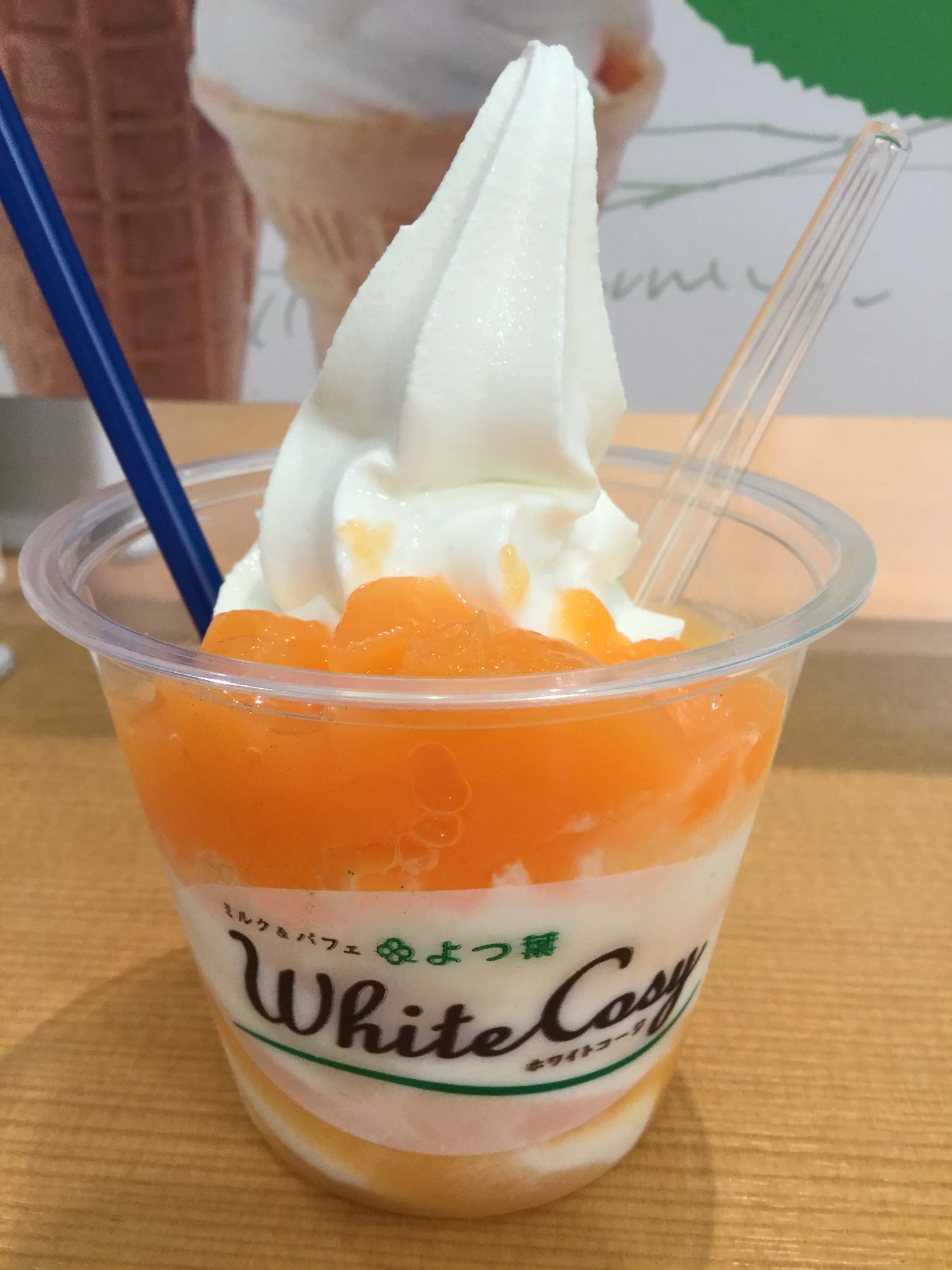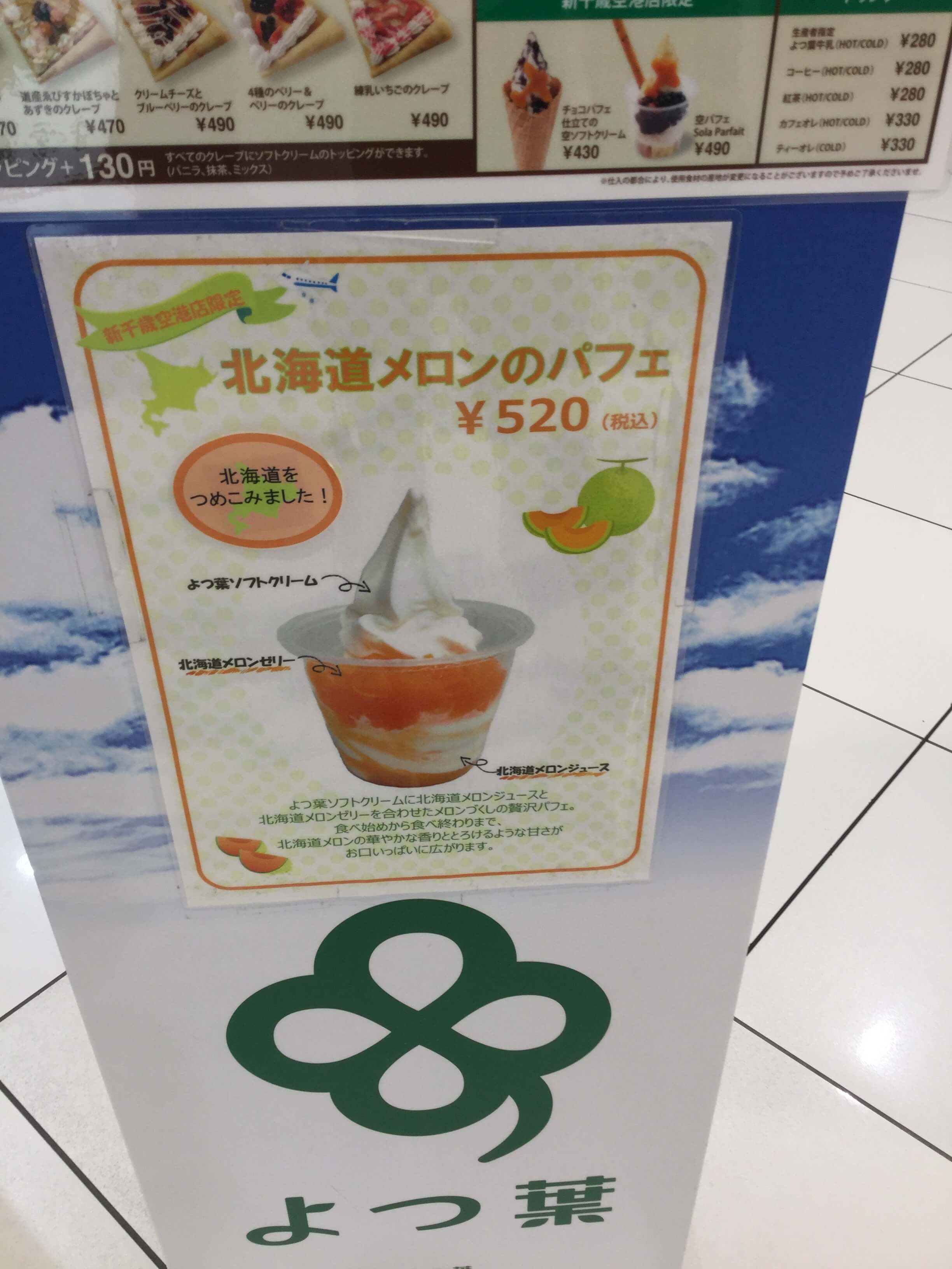 「よつ葉ホワイトコージ」の「北海道のメロンパフェ」です。美味しそうなソフトクリームにメロンジャムとメロンジュースが添えられたメロン尽くしのデザートです。口に入れるとメロンの香りと甘さが広がり、濃厚なソフトクリームも美味しくペロッと食べてしまいました。