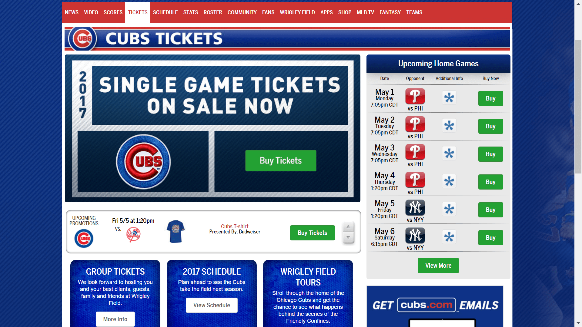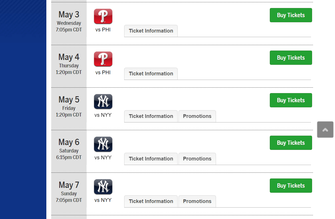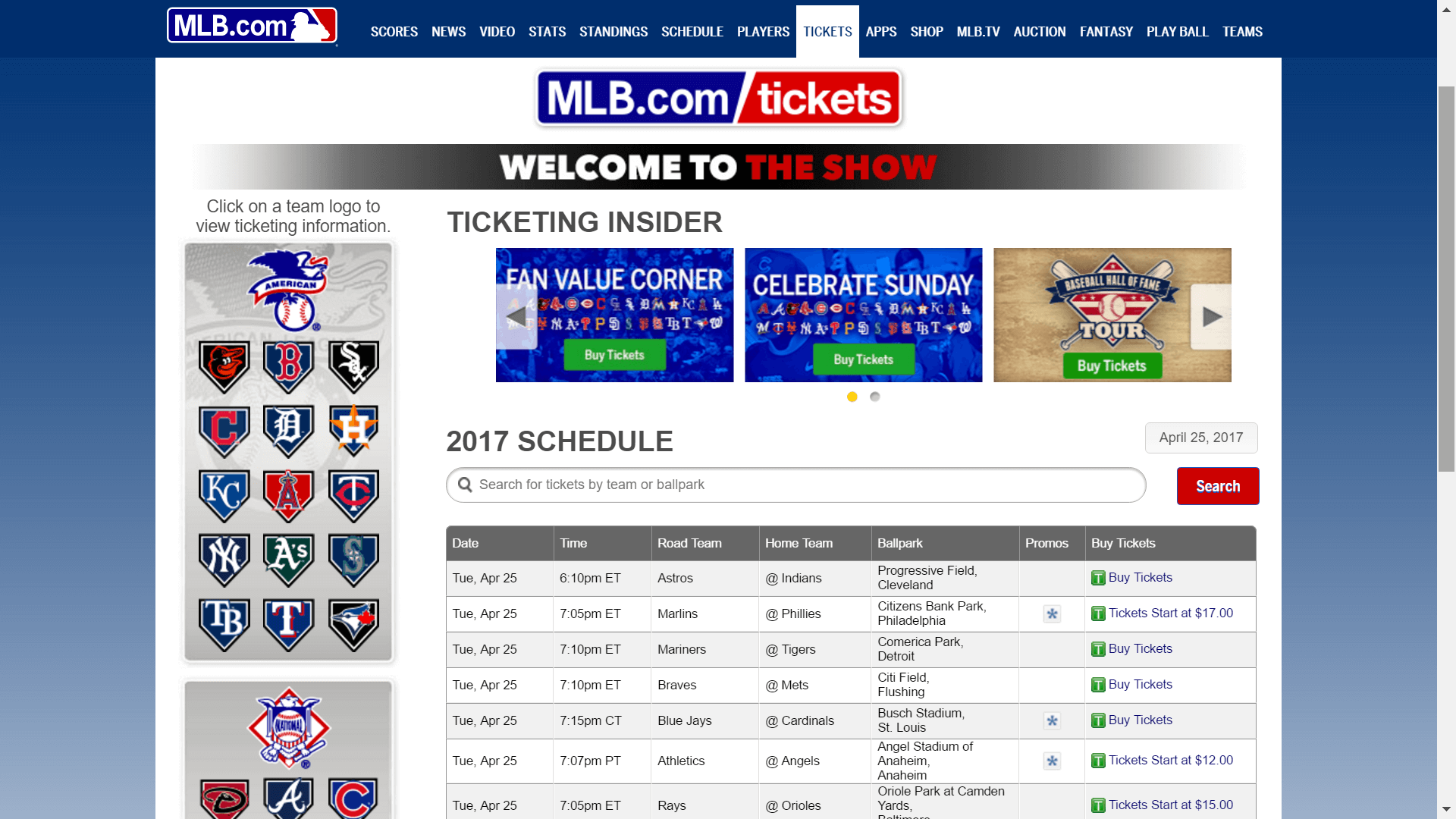 左のチームのロゴをクリックするとチームのスケジュールが出ますし、右のカレンダーをスクロールしていき見たい試合の右端の「Buy Tickets」をクリックする