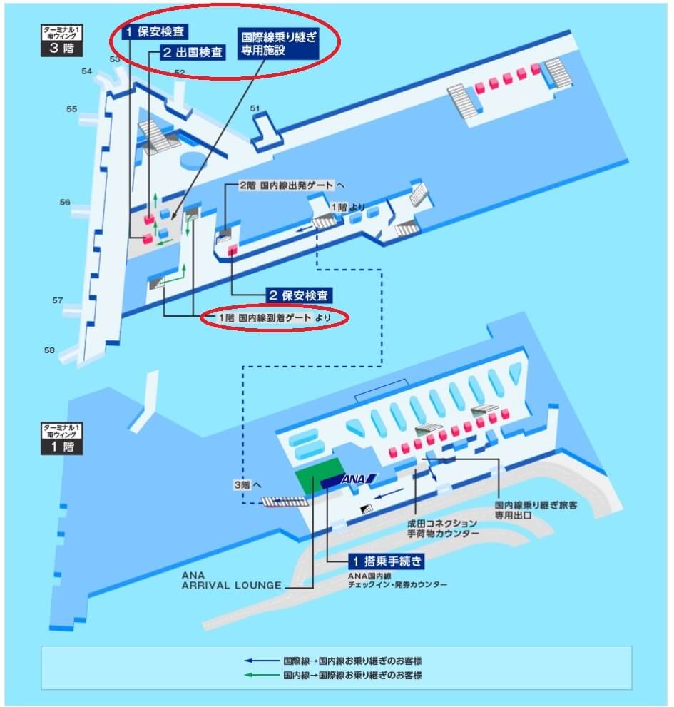 成田空港での国内線→国際線乗り継ぎ専用保安検査場と出国審査場