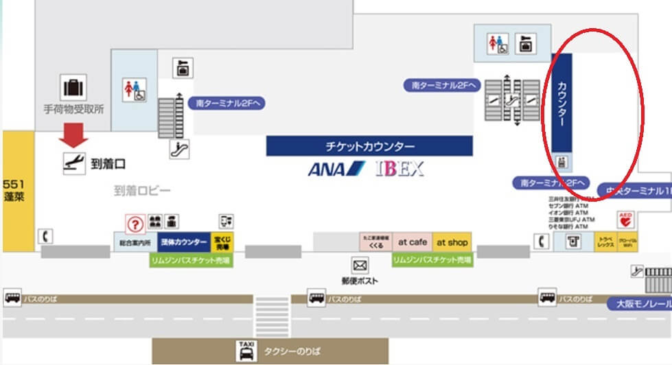 伊丹空港ではスルーチェックインは「国際線乗り継ぎカウンター」で行います。伊丹空港では国内線の搭乗手続きカウンターやプレミアムチェックインではできません。「国際線乗り継ぎカウンター」は南ターミナル1階の隅にあります。 下の地図の赤丸の部分です。