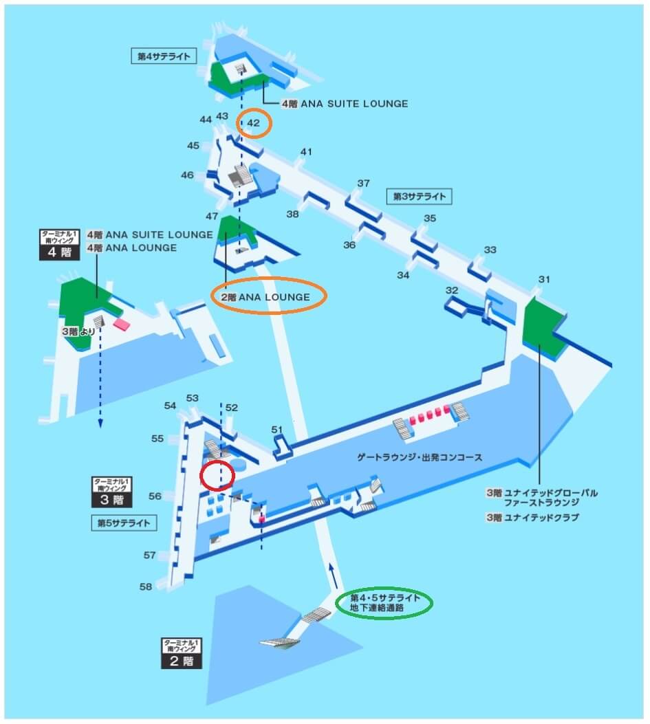 ANAラウンジは出国審査を過ぎて出てきた赤丸の地点から近い場所(第5サテライト)と、出発ゲートに近い場所(第4サテライト)の2か所にあります。しかし、出発ゲートまでの移動時間が読めないので出発ゲートに近い第4サテライトのANAラウンジ(上の地図オレンジ丸)を利用することにしました。 出国審査と移動で想定外に時間を取られました。16時05分に何とかANAラウンジに滑り込みます。