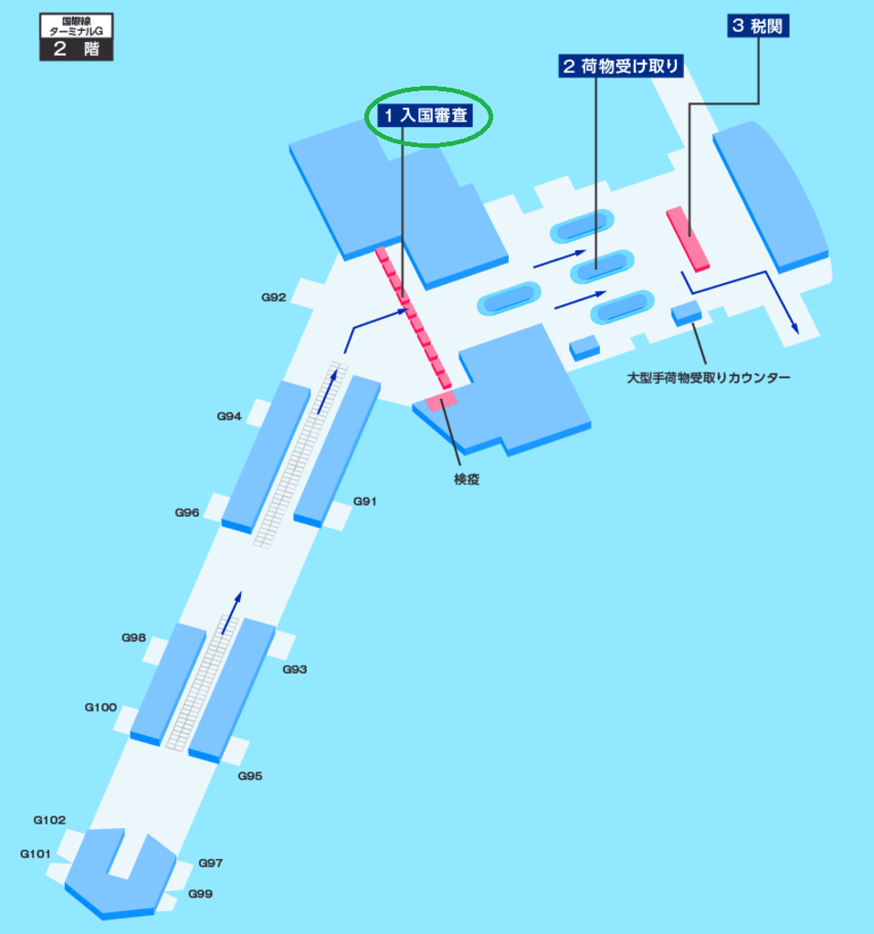 11時10分に降りて11時15分くらいには上の図の緑丸の入国審査の列に並びます。ファーストクラスのスーツの男性は地上係員がさっと誰も並んでいないブースに誘導します。政府関係者など超VIPだったのでしょうか。