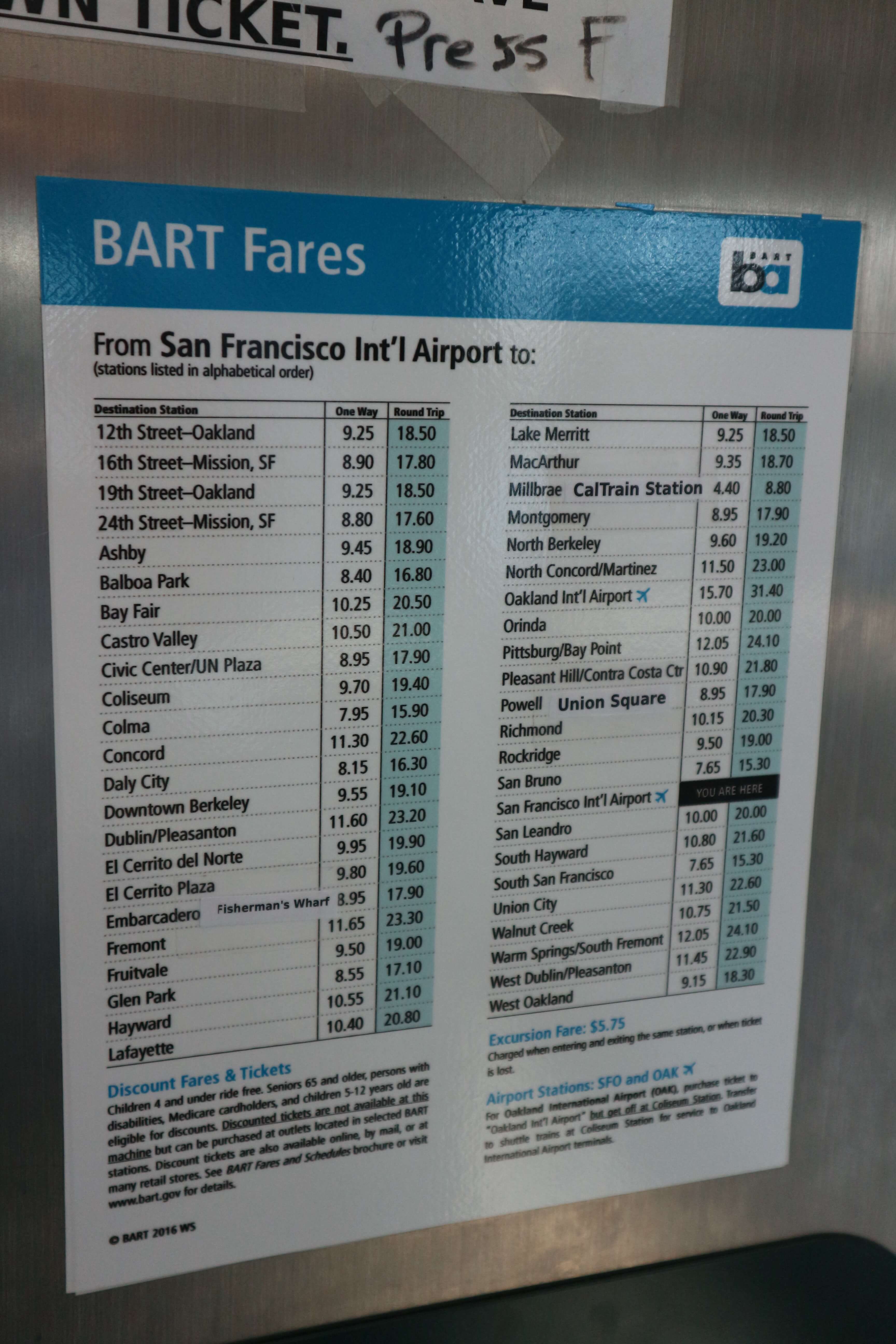 券売機右側に運賃表が貼ってあります。行き先名と料金が書いてある表です。行き先名はアルファベット順にならんでいます今回はユニオンスクエアに最も近いPowell駅に向かいますので、8.95ドルになります