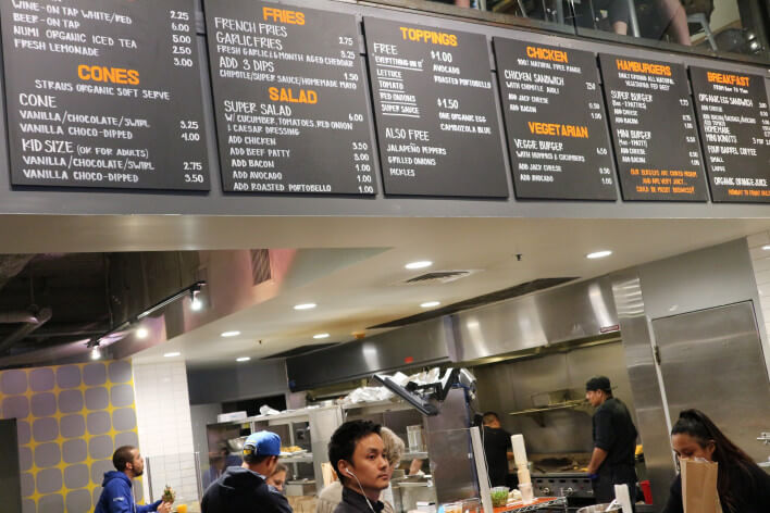 最初にレジに並んでオーダーをします。ハンバーガーはSuper Burger(パティ2枚)とMini Burger(パティ1枚)という、サイズ違いの2種類があるだけです。これに好みでトッピングしてカスタマイズするスタイルです。 無料のレタス、トマト、赤タマネギとスーパーソースはEverything on itと言えば全て入れてくれます。チーズ(0.75$)、ベーコン(1$)も追加できます。また別の黒板になっていて見落としそうになりましたが、これにお好みでハラペーニョやグリルドオニオン、ピクルス(無料)、アボカドやローストマッシュルーム(各1$)、オーガニックの卵やcambozolaというブルーチーズ(各1.5$)を追加できるようです。 そしてもちろんFrench FriesやGarlic Friesといったポテトやサラダもあります。