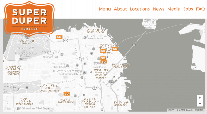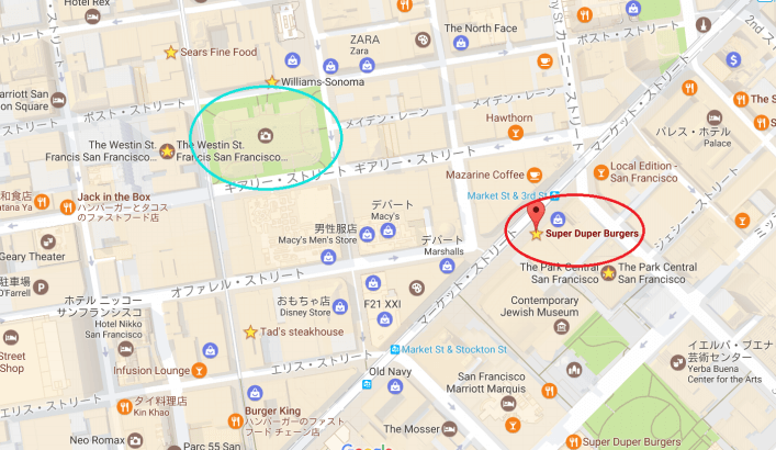 Super Duper Burger(スーパーデューパーバーガー)は赤丸の場所です。ちなみに青丸がUnion Squareですし、Powell駅からも歩いて5分もかかりません。Powell駅やUnion Squareからも近く観光客には行きやすいお店だと思います。