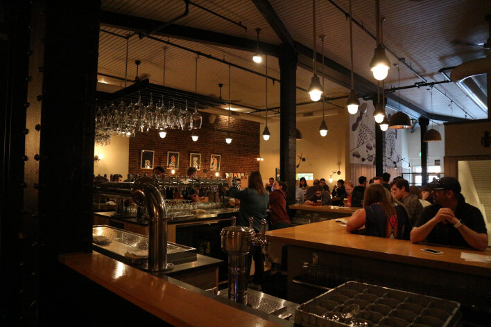 もちろん21歳以上しか入店出来ず、入り口でIDチェックがあるので、パスポートなど身分証明書を忘れずに行きましょう。 内装は木やレンガで作られ、柱がむき出しで、倉庫のような雰囲気で、店内は薄暗くて暖かみのある照明がいい感じで木やレンガにマッチしています。お店を入って、通路を進むと、メインのバーカウンターがあり、中央には、大きなビールサーバーと数多くのタップがありました。その周りにぐるっとテーブルが並んでいます。