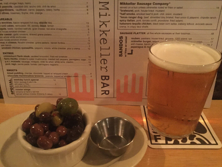 せっかくなのでMikkellerの冠がついたビールを飲もうとMikkeller Belgian Wild Paleを注文しました。そしてメニューには数多くの美味しそうなフードが並んでいましたが、ステーキを食べた後であまりお腹が空いてなかったので泣く泣くmixed olivesのみを注文しました。 ビールはホップの効いたクラフトビールらしいビールで美味しかったです。