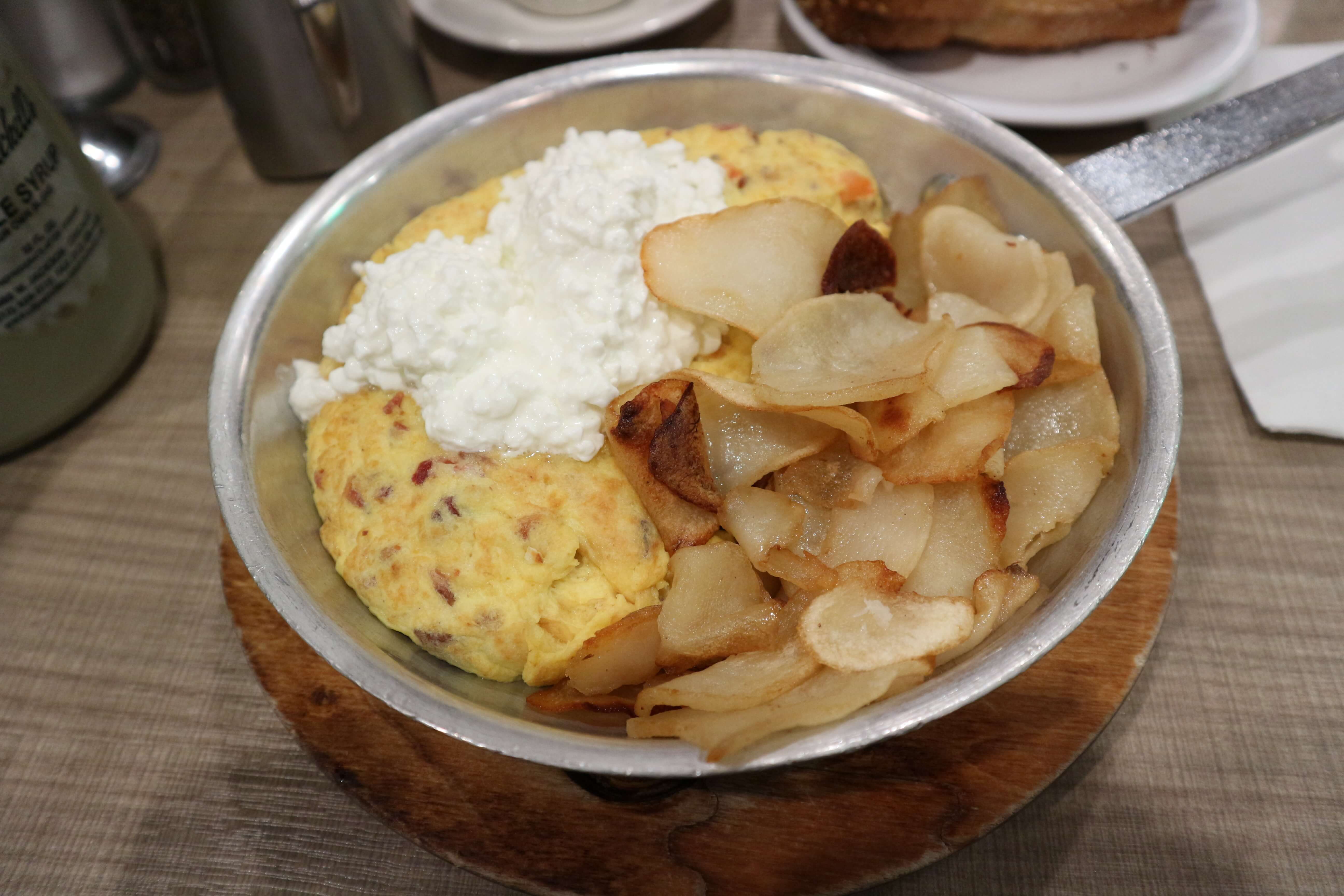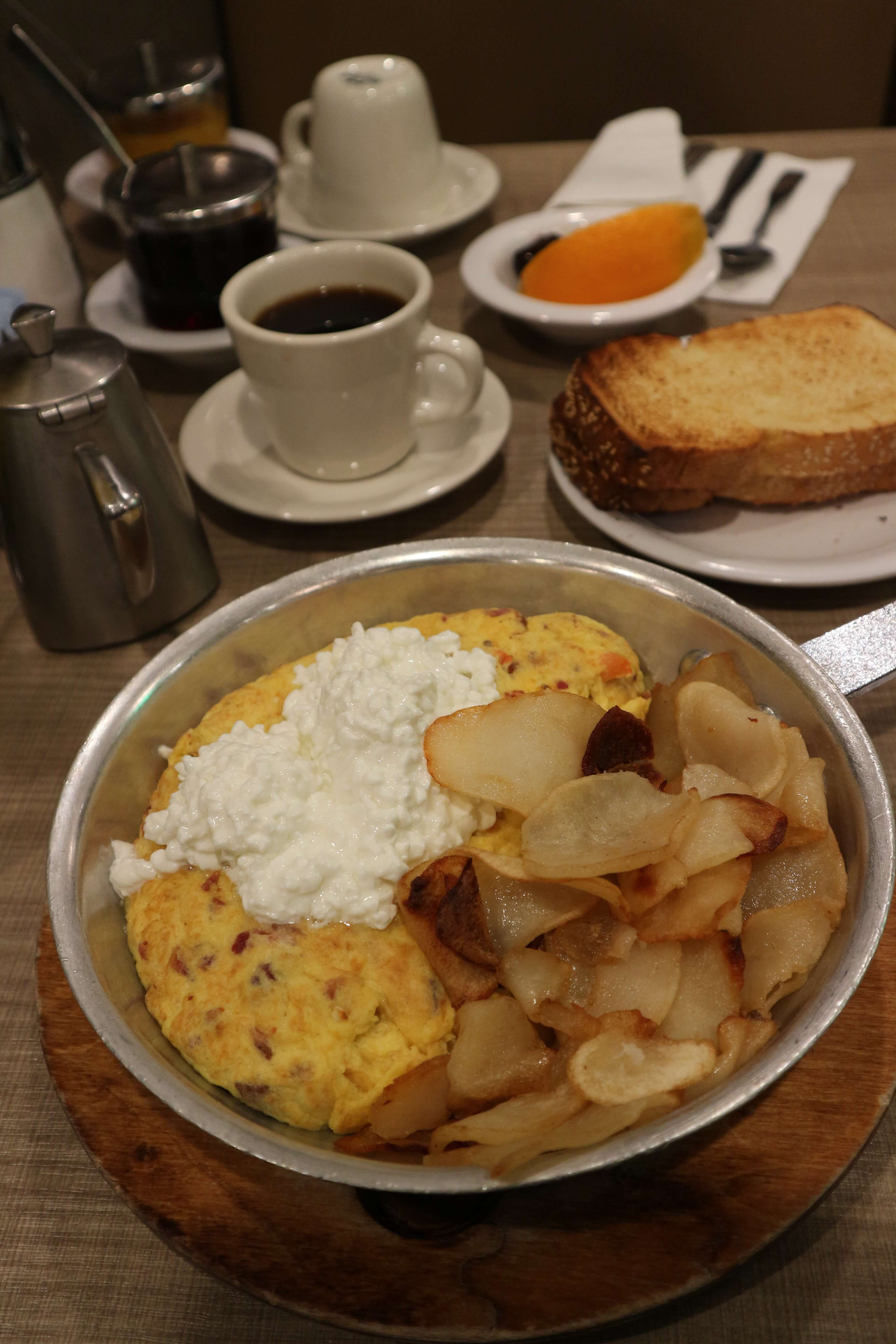 でっかいフライパンに乗ったままカッテージチーズがかかったオムレツがやってきます。卵をいくつ使っているんだというくらい大きなオムレツがフライパンの半分を占めます。そして残りの半分にはやはりポテトが山盛り。その上食パンが2枚ついてきます。