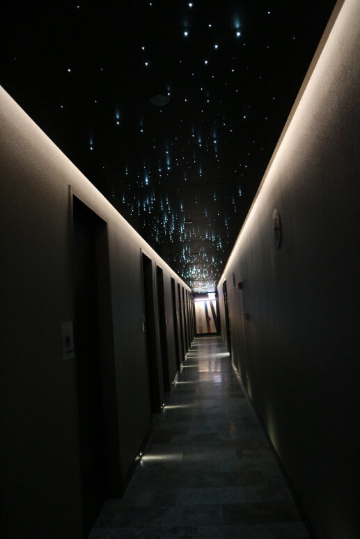 扉を開けてシャワーを浴びたい旨を伝えるとシャワールームに案内されます。シャワールームは6つありシャワールームに向かう廊下の天井はやはり星空をイメージしたLED照明です。