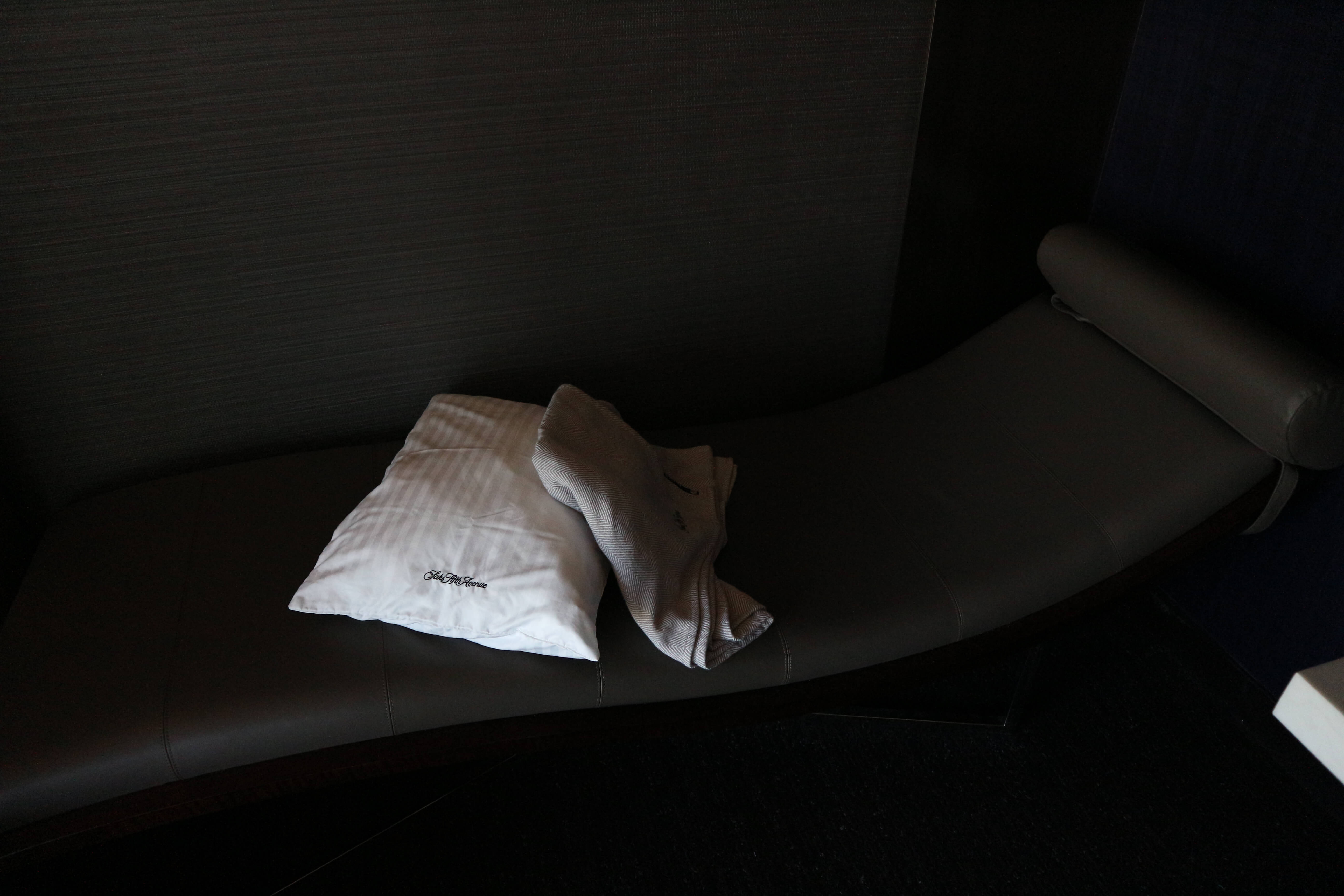 シャワールームのバスマットやバスタオルと同様のSaks Fifth Avenueブランドの枕、毛布、スリッパ、アイマスク、耳栓、Pillow Mistなる小瓶、スピーカーが用意されています。 Pillow Mistは初めて見ましたが枕に吹きかけるアロマみたいなものなのでしょうか。