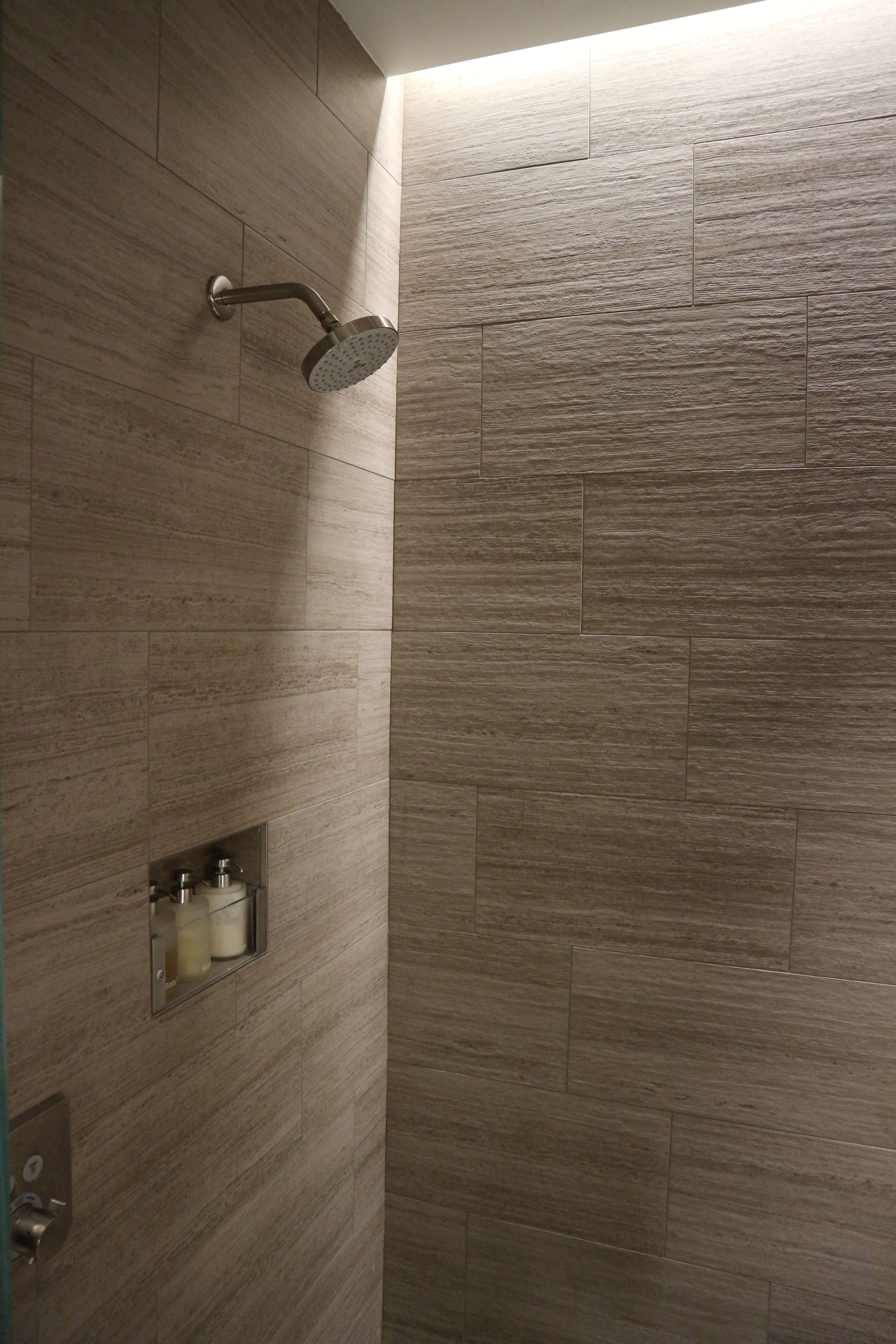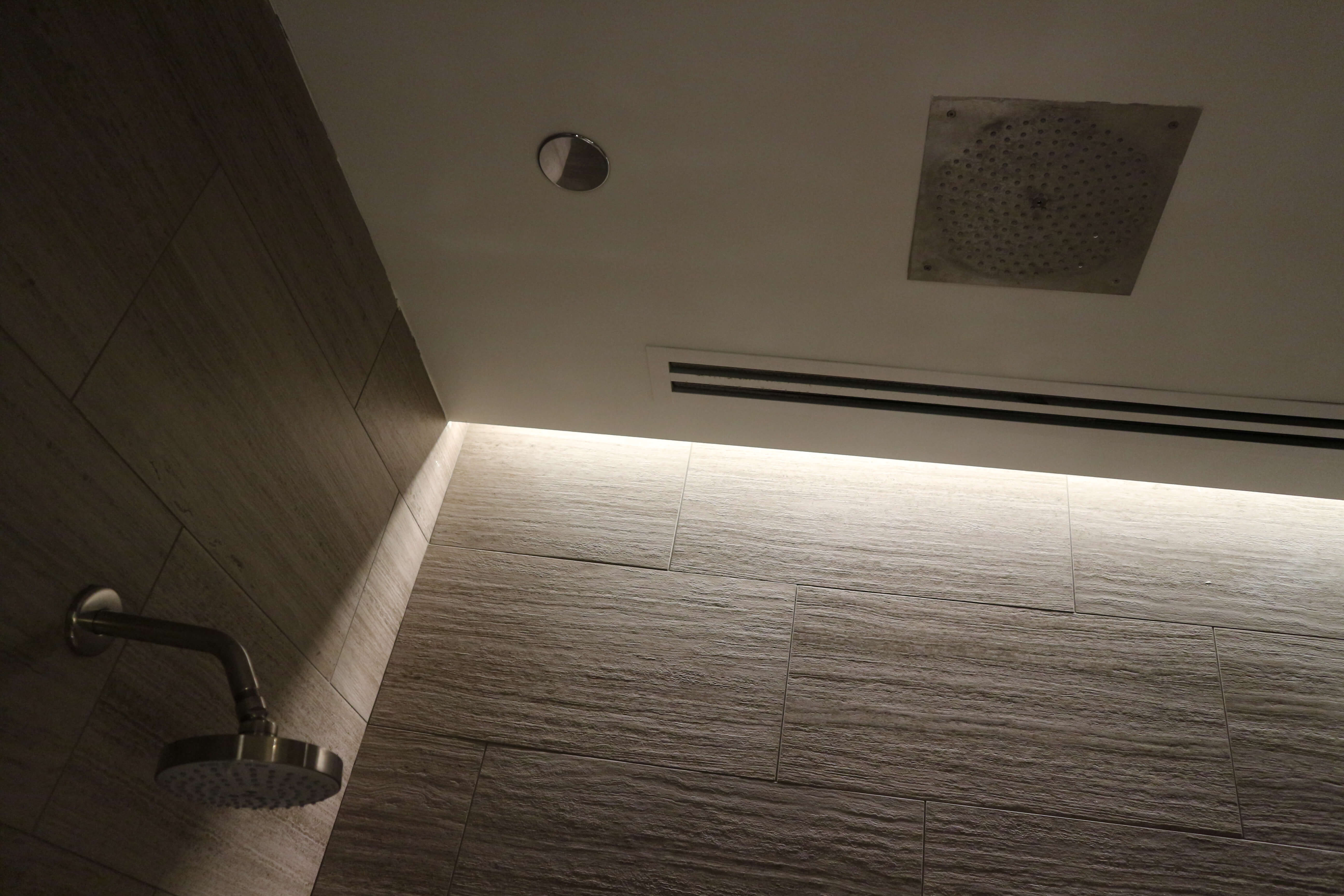 シャワーは天井から降り注ぐタイプ、壁に固定されたタイプの2つがあります。