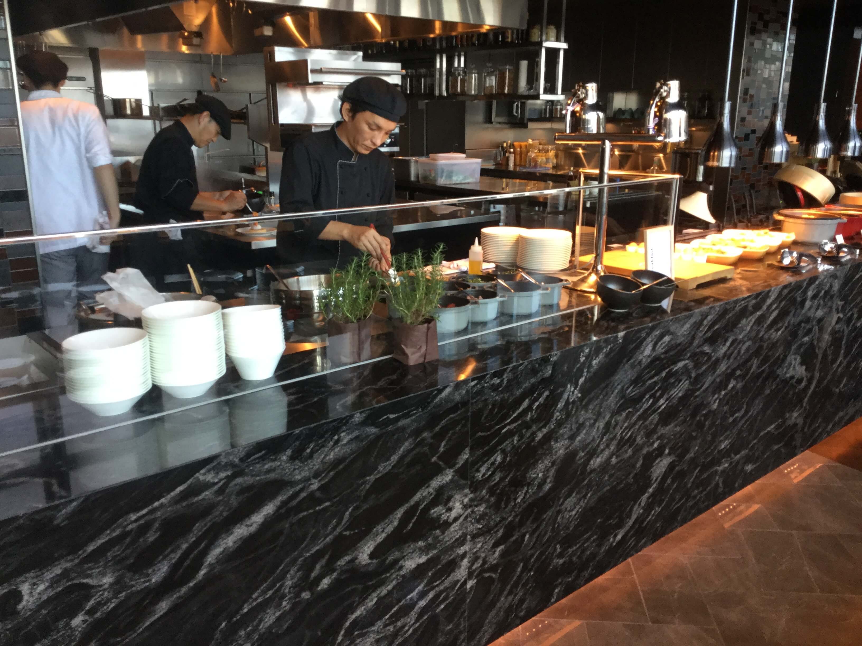 残りの料理はもちろん自分で取りに行きます。オープンキッチンになっていて、中で調理している様子もよく見えます。